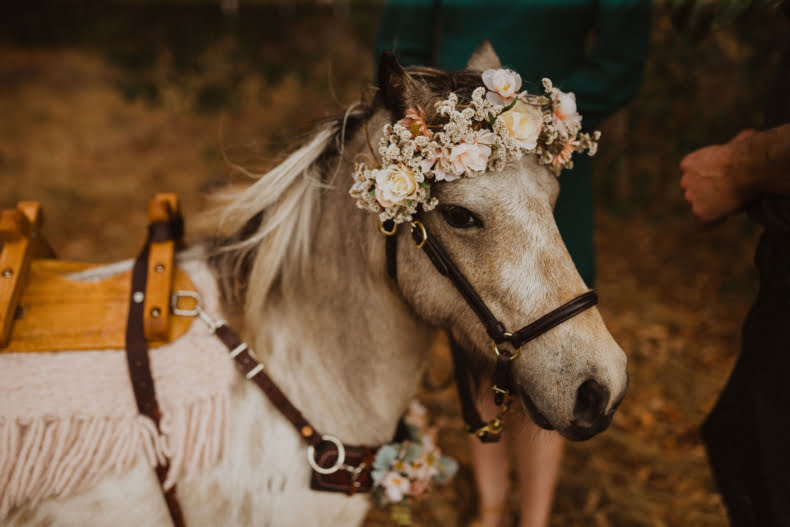 FAVE DEETS “My friend’s miniature pony, Pablo, was part of the bridal party – he wore a mini pack saddle with baskets full of dried rose petals on each side. While we signed the marriage certificate the guests lined both sides of the aisle, as Pablo was led past everyone took a handful of petals to throw during the recessional. He took his job very seriously and aside from a few nibbles of the bouquets, was perfectly behaved.”
