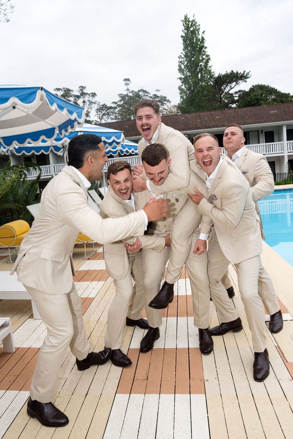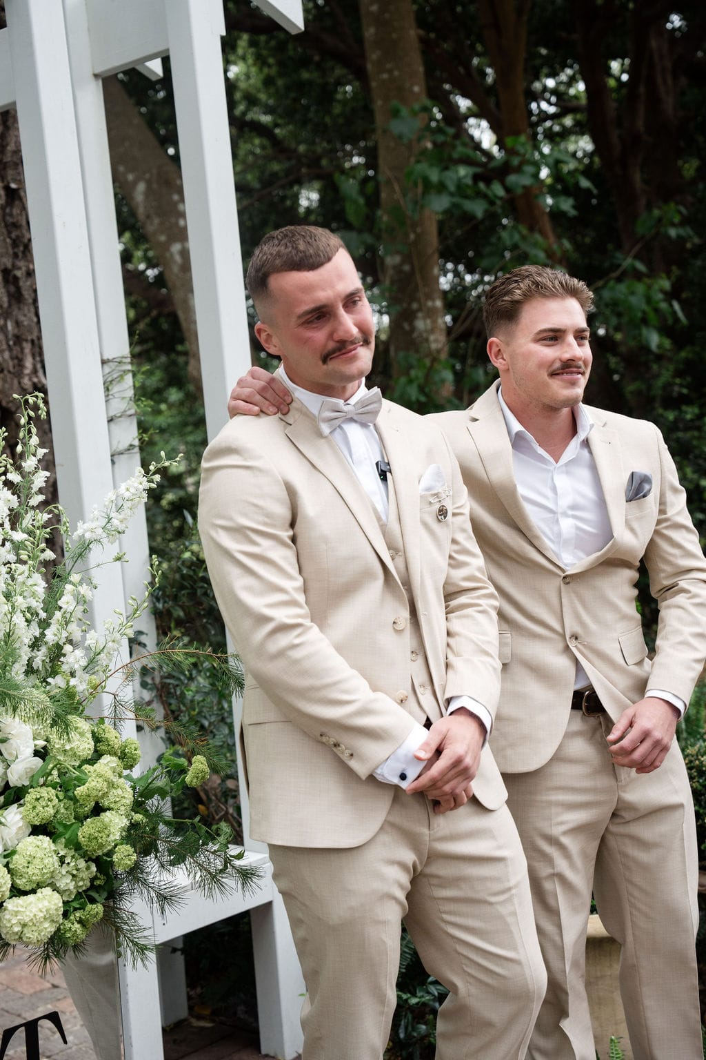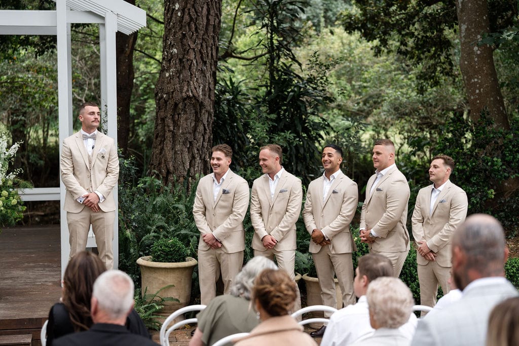 “Aaron had previously done some work with [stylist] Jamie Azzopardi and had reached out to him in confidence that he could assist him and his groomsman. The boys organised a fitting day where they tried on a few different suits in David Jones, of which they all loved the fit and colour of the Van Heusen.