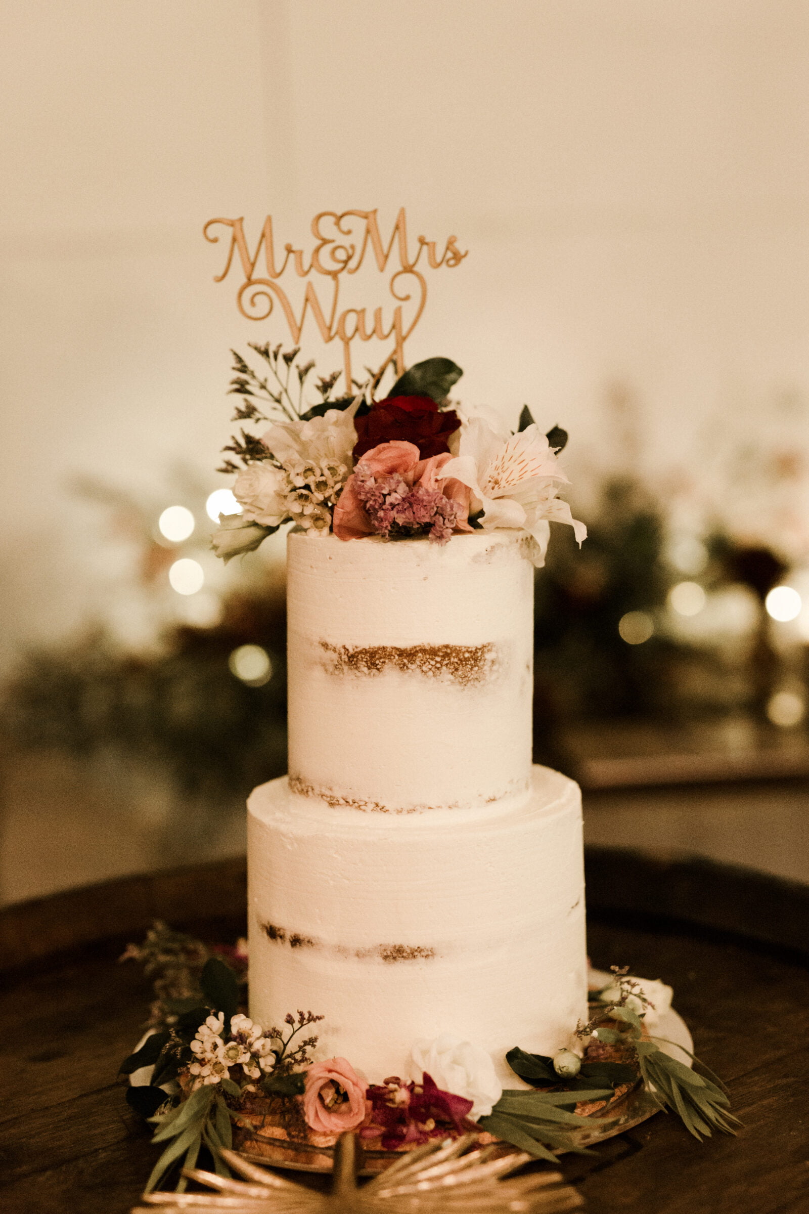FAVOURITE DETAILS “I really loved the styling of the ceremony. As we had the set up outside in a tiny green oasis at the back of the Imperial Hotel, it was essentially a blank canvas! The dark greenery behind our arbour really added to the overall look combined with our florals and styling. I also really loved the reception set up. It set the mood for the party, and I loved that we chose to have a cocktail style wedding with big wine barrels, fairy lights and festoon lighting.”