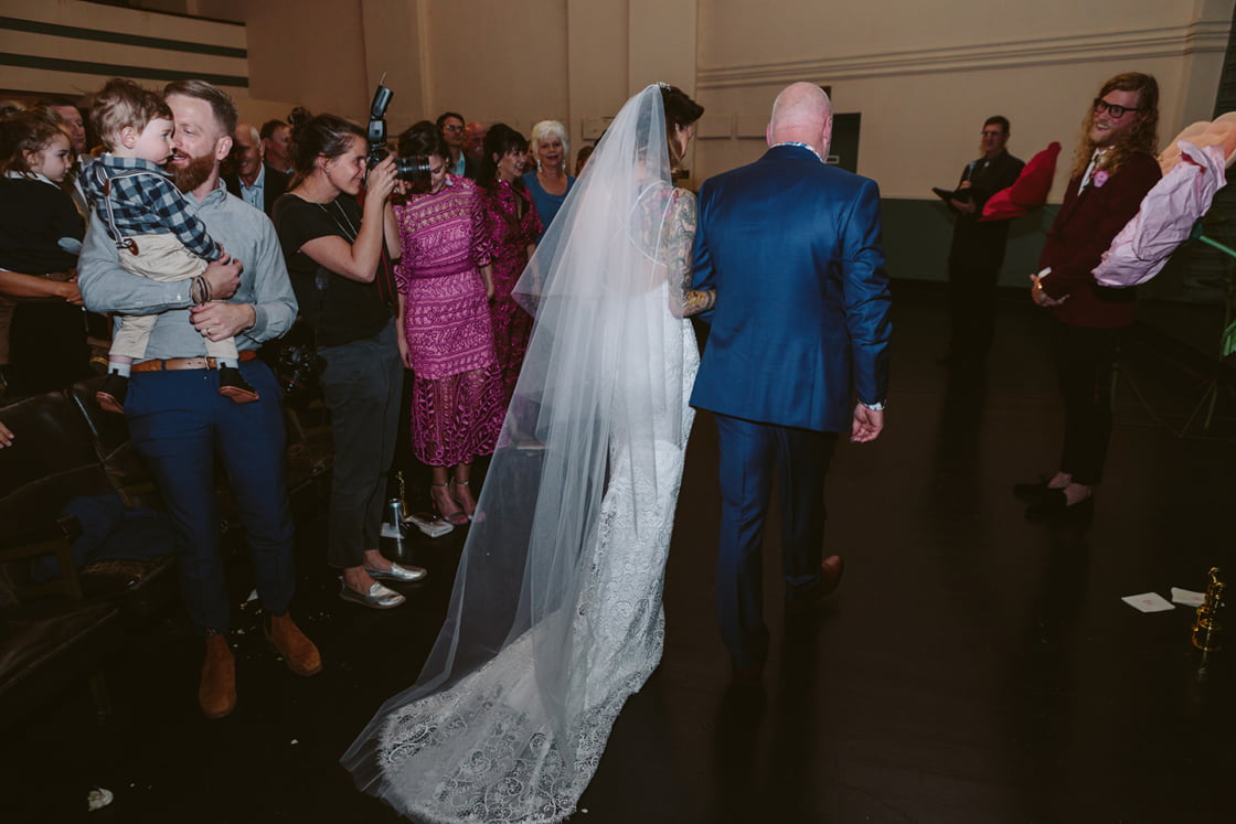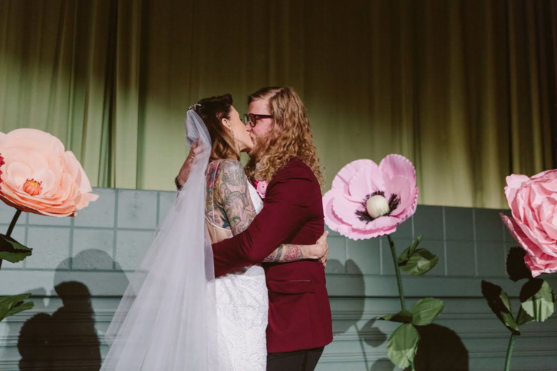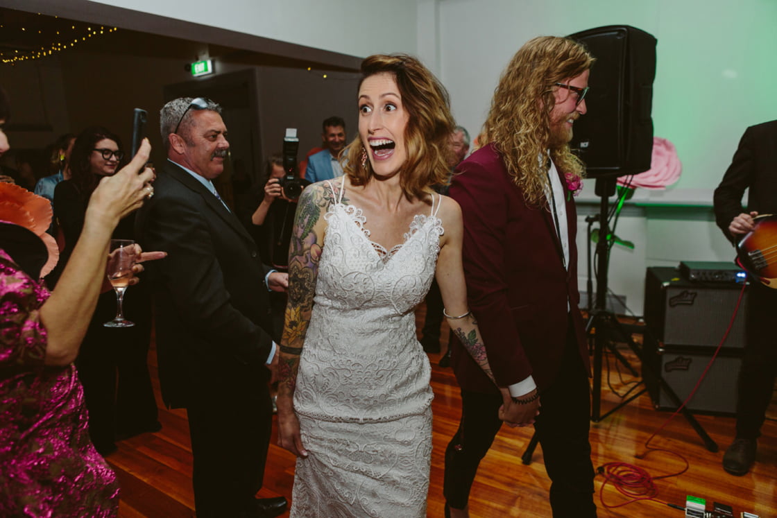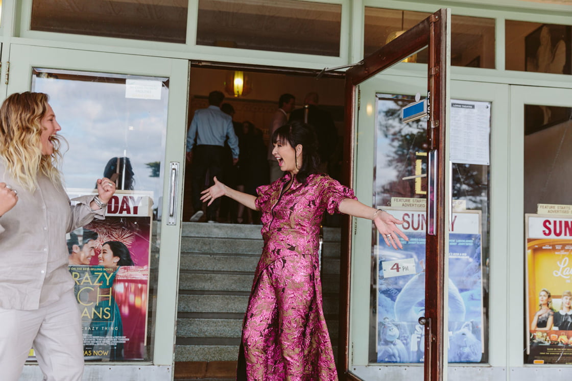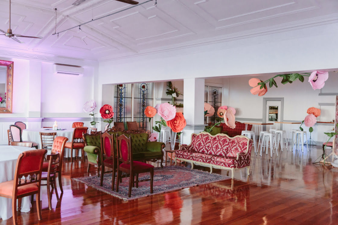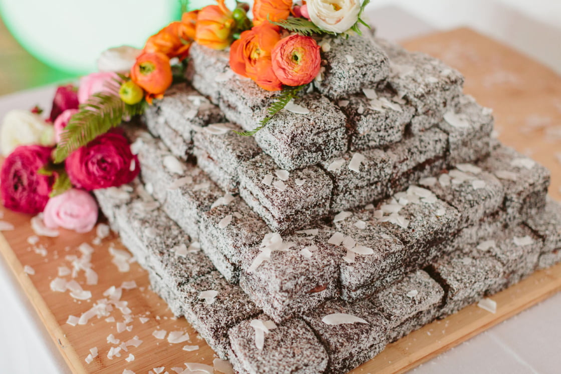 FAVOURITE DETAILS “Our oversized 6 foot tall flowers that were placed throughout the ballroom were incredible. They really added a sense of life and movement to the day. We loved the vintage furniture we rented from Good Day Rentals– it complimented the colors and vibe so well! We hosted our own ‘Stoney Awards’ (a take on the Emmy’s or Golden Globes) at the cinema where we nominated guests under each category some of which included ‘It’s Five O’clock Somewhere Award’ and ‘Most Likely To Spike The Punch’ award and awarded the winner with a $2 gold trophy, which was pretty ace. Oh, and the lamington tower cake! Everyone went nuts over that. I still think my dry cleaner is cleaning jam off my dress….”