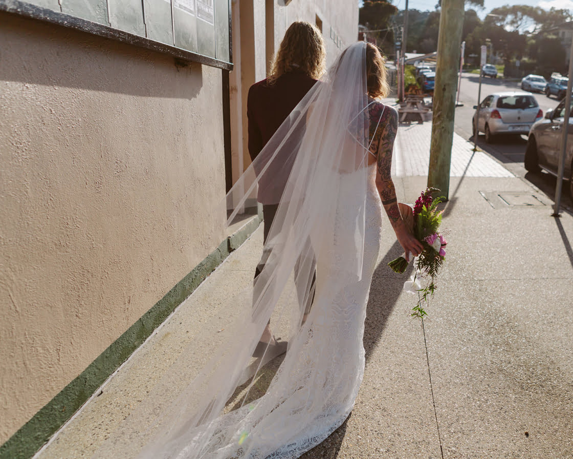 CONTRIBUTING VENDORS Photographer Beck Rocchi Cinematographer Cyan Wolves Event Planner Daniel Clifton Florist Sweet Blossoms Gisborne Stationery Paperless Post Ceremony Venue Lorne Theatre Reception Venue & Catering Grand Pacific Hotel Cake Mt Macedon Trading Post Hire Items Good Day Rentals, Memphis Hire Lighting Hire Harry The Hirer Celebrant Danny Stone Rings Tara Lawson, Robert H Parker & Sons BRIDE Dress & Veil One Day Bridal Shoes Jessica Simpson Accessories Mimco Hair Dept. Z Salon Makeup Sarah Lea GROOM Jacket, Shirt, Pants & Shoes Topman Watch Adidas