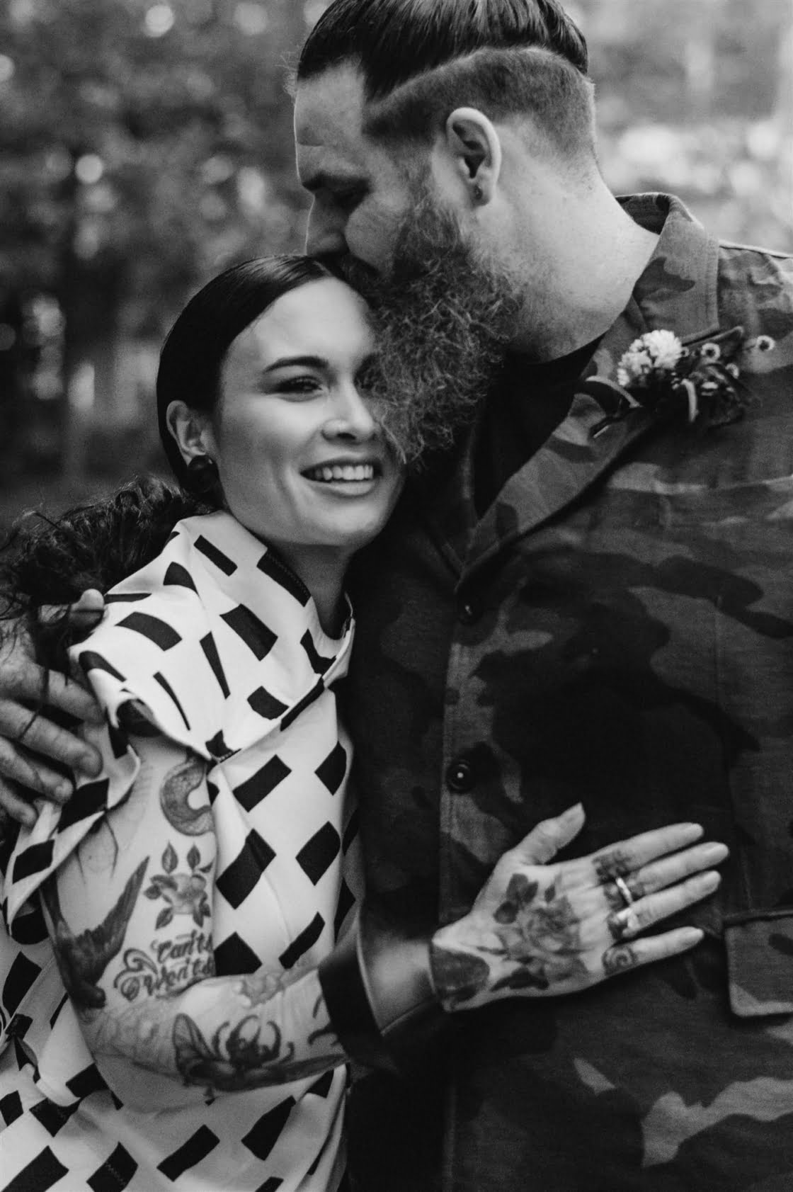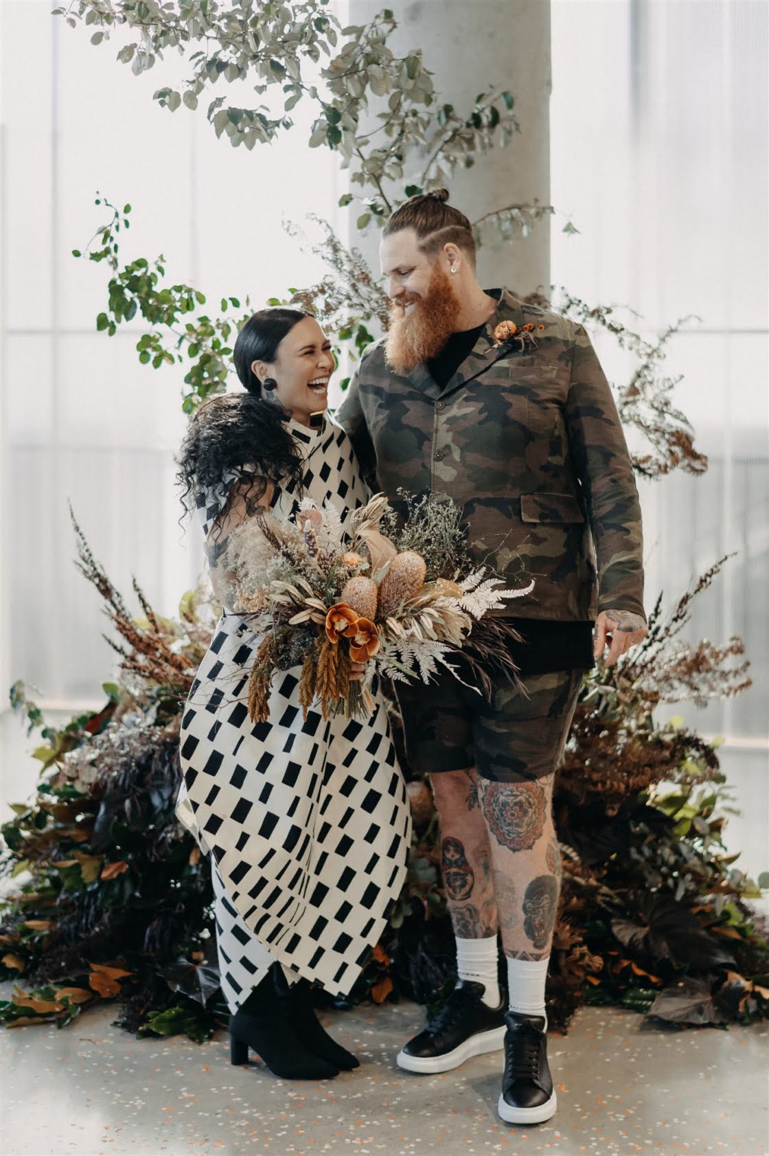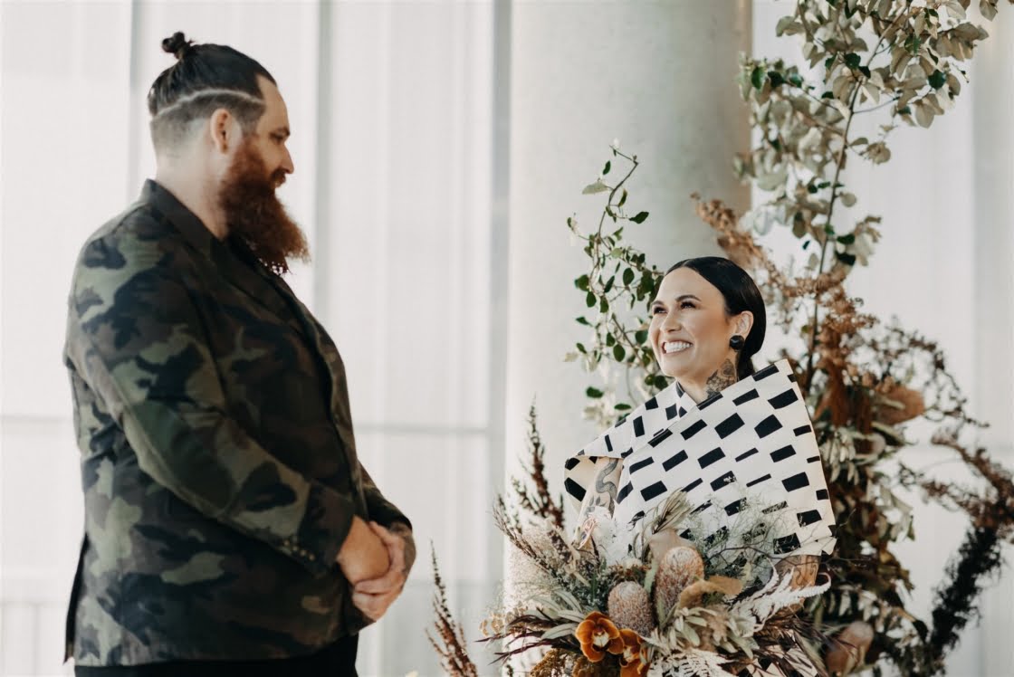 Together for ten years now, “we have miraculously survived without murdering each other, so that has to be a testament of true love and tolerance (lol),” these two cool cats are truly one of a kind and we couldn’t wait to share this wedding. Yes, ok, it may have had something to do with that cray-in-the-best-way wedding dress. And definitely the groom in camo. Also maybe those incredible dried flower arrangements (by one of our fave florists Laurel & Lace). Then there was the ceremony by one of our go-to celebrants, Shannon O’Heir, and pics by the talented lens lady Lauren Campbell. I mean if that’s not a recipe for a damn good wedding, we don’t know what is! Scroll down for more…