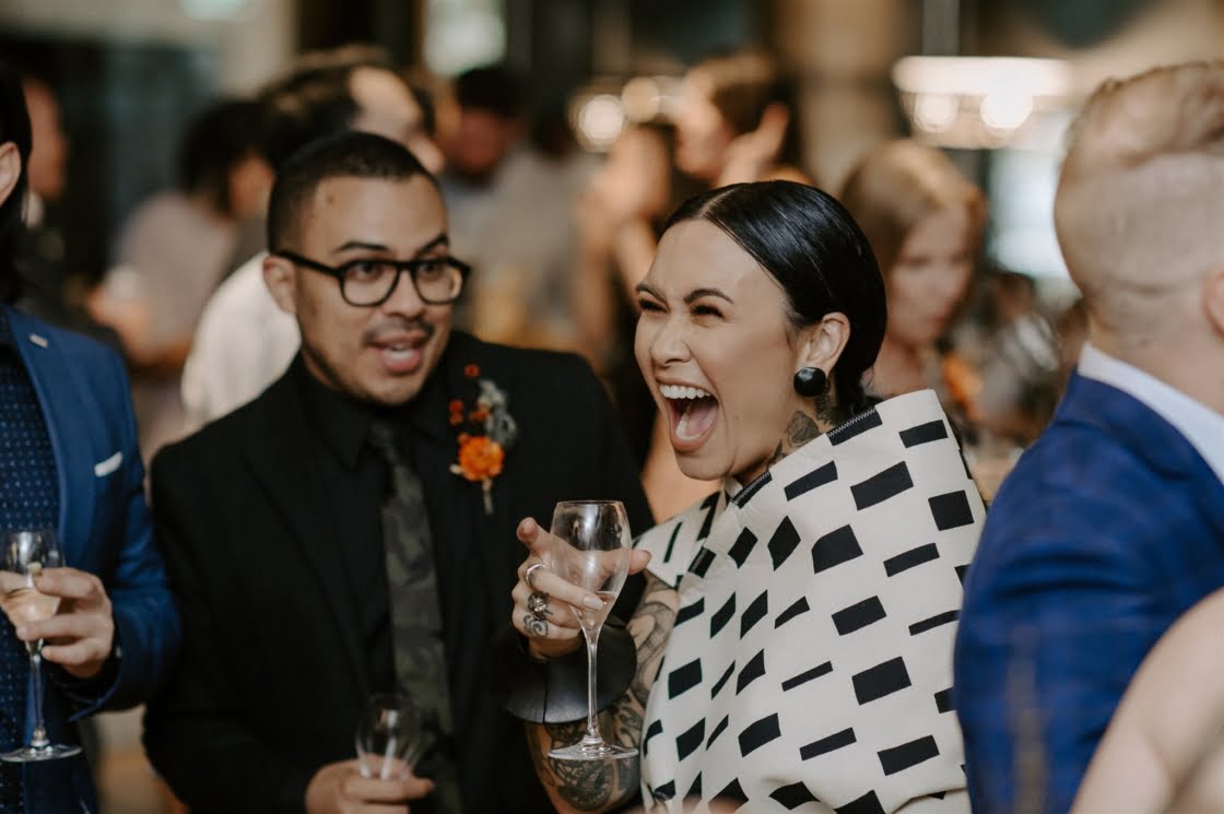 STANDOUT VENDORS “Laurel & Lace absolutely nailed our florals. We instantly connected. Viewing the gallery space together to discuss ideas turned into us grabbing a beer afterwards and chatting all things non-wedding for a few hours. I was truly blown away when I saw our bouquets, as they were better than anything I could have expected. It wasn’t just us that loved her work, we had so many compliments on the day and after the wedding about how amazing our floral arrangements were set up at both the gallery and reception space. Lauren Campbell, our photographer, was amazing – in the few days leading up to our wedding day when COVID space recommendations were first being mentioned and we didn’t know if our wedding would be able to go ahead. She was so accommodating. On the day she made us feel so comfortable and like a true photography magician, she was able to capture amazing moments without us even realising she was obviously there. Shannon O’Heir Marriage Celebrant was down from the onset to completely cater our ceremony to our needs, which for me was taking as much attention of us as possible. I didn’t want anything overly sentimental and she was able to make our ceremony completely light-hearted, full of laughs and had the brilliant idea of sharing stories about our bridal party so the spotlight was shared, which put me at ease. Our hands-down godsend was Elisa who was the gallery and events coordinator for aMBUSH Gallery in Canberra. [Also] Sam from Artforme Letterpress Studio, Saadia of La Ombre Creations was amazing.”