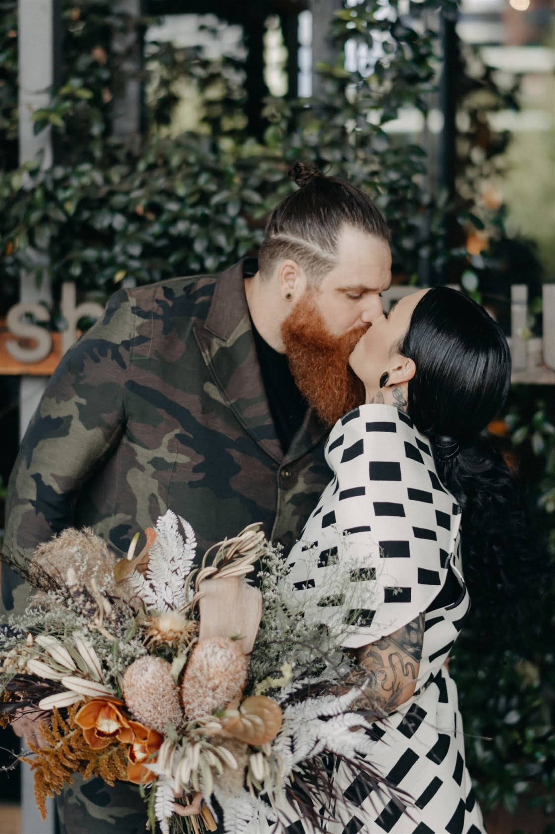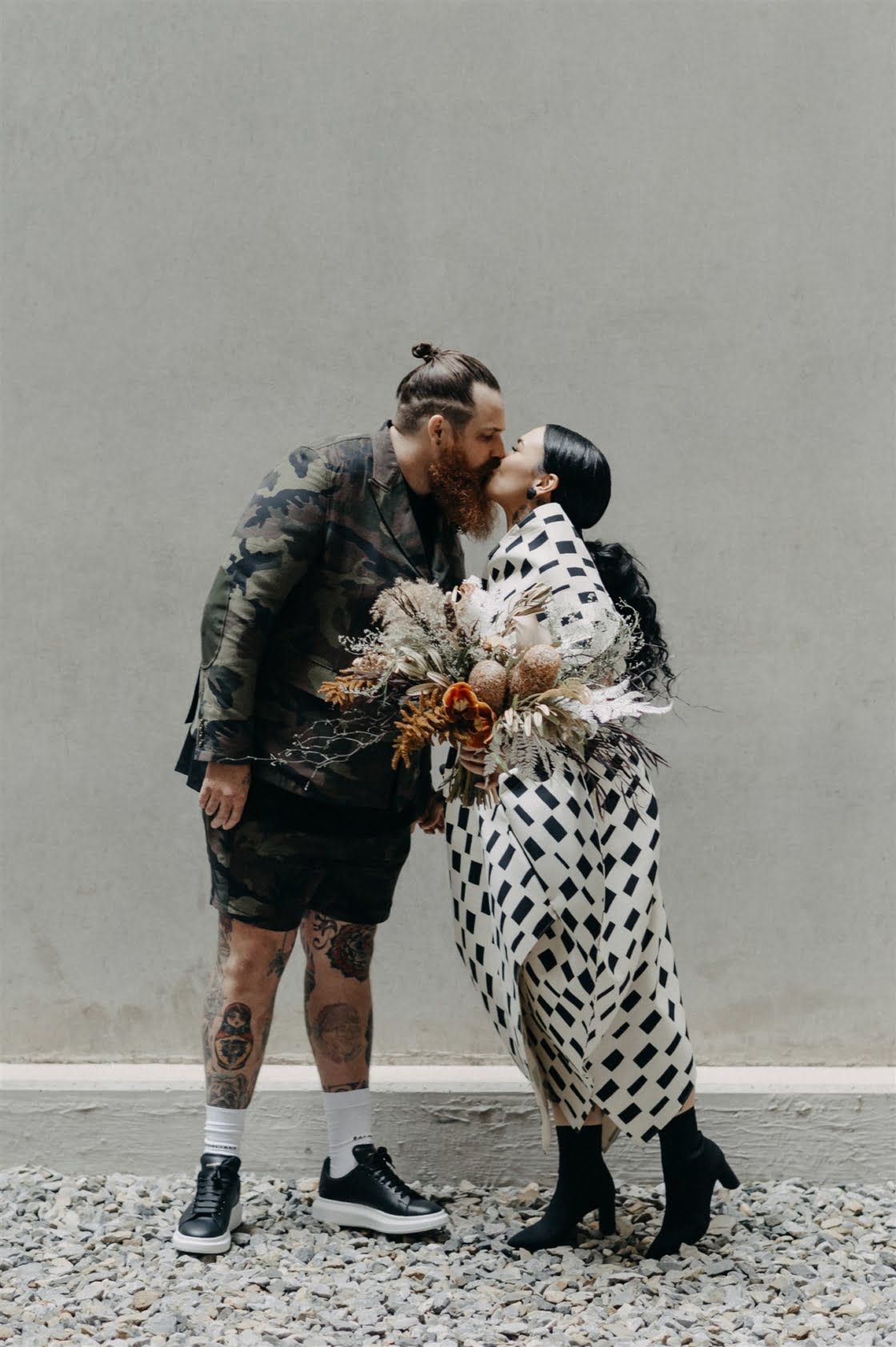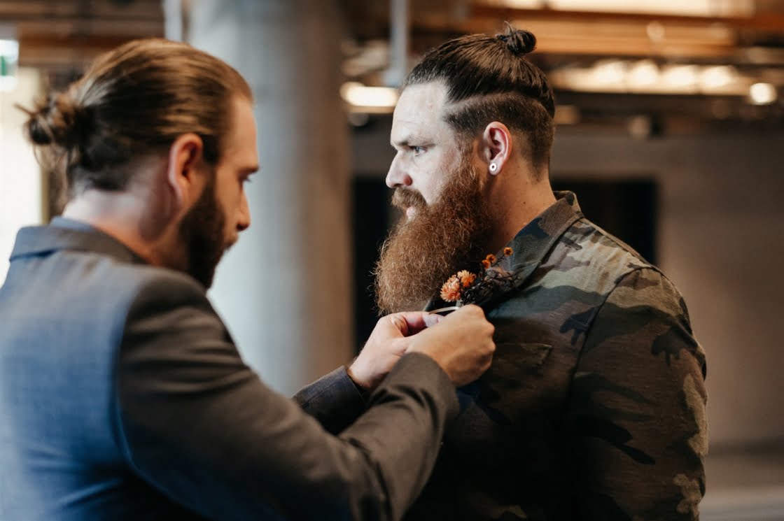 Together for ten years now, “we have miraculously survived without murdering each other, so that has to be a testament of true love and tolerance (lol),” these two cool cats are truly one of a kind and we couldn’t wait to share this wedding. Yes, ok, it may have had something to do with that cray-in-the-best-way wedding dress. And definitely the groom in camo. Also maybe those incredible dried flower arrangements (by one of our fave florists Laurel & Lace). Then there was the ceremony by one of our go-to celebrants, Shannon O’Heir, and pics by the talented lens lady Lauren Campbell. I mean if that’s not a recipe for a damn good wedding, we don’t know what is! Scroll down for more…
