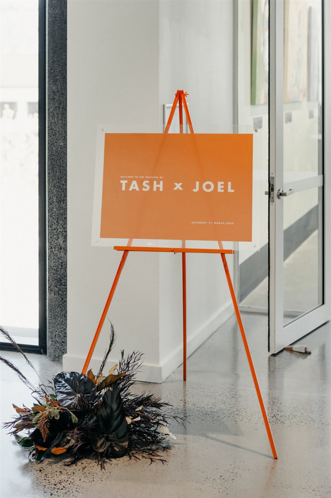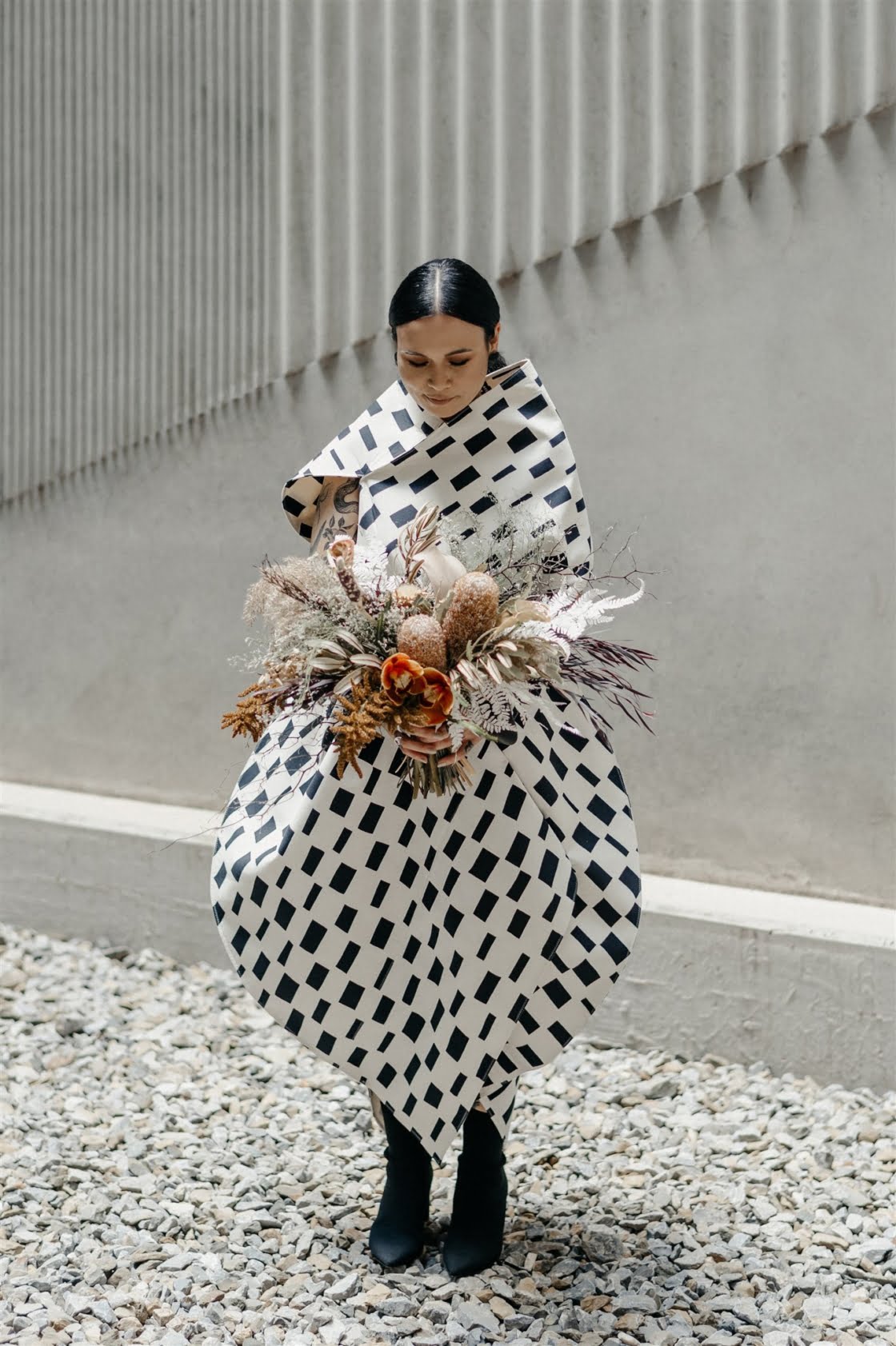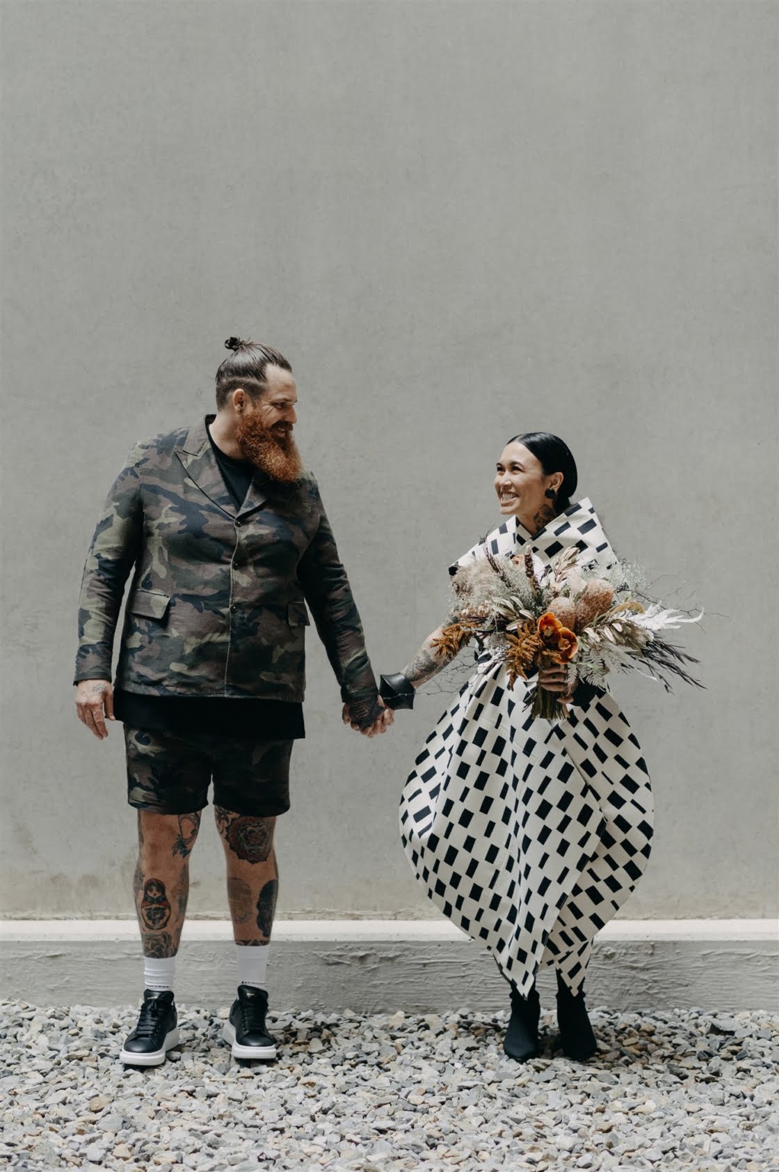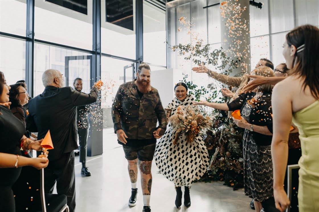 THE INSPO “Actually started from our choice in wedding outfits. Joel and I both chose our own wedding outfits which by chance both happened to be Comme des Garcons – Junya Watanabe designed pieces. From the sculptural shape of my dress and both having unique prints, I wanted to pay homage to that elevated Japanese fashion feel, so the theme was to incorporate fashion, art, design, and an earthy, tribal take on a modern bride/ wedding (which developed from my choice of reception outfit and jewellery for the day). Another theme we incorporated was warm/ Autumnal tones, which we chose to display through our florals, to work with our wedding suite (mandarin orange) colour palette and link these design elements together.”