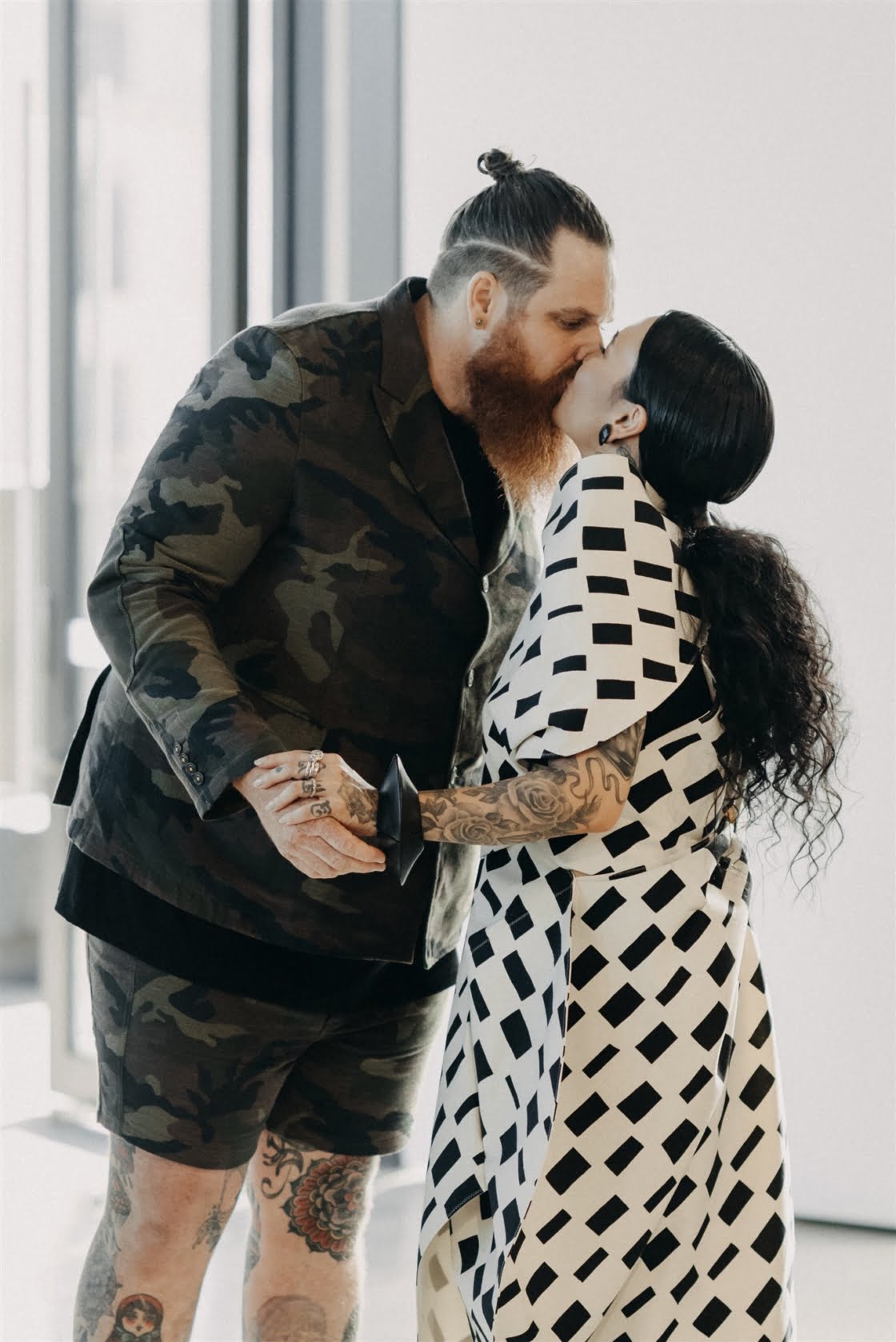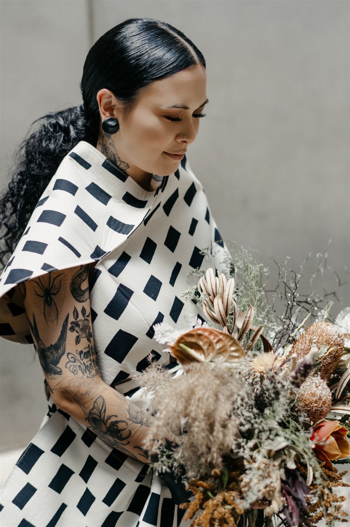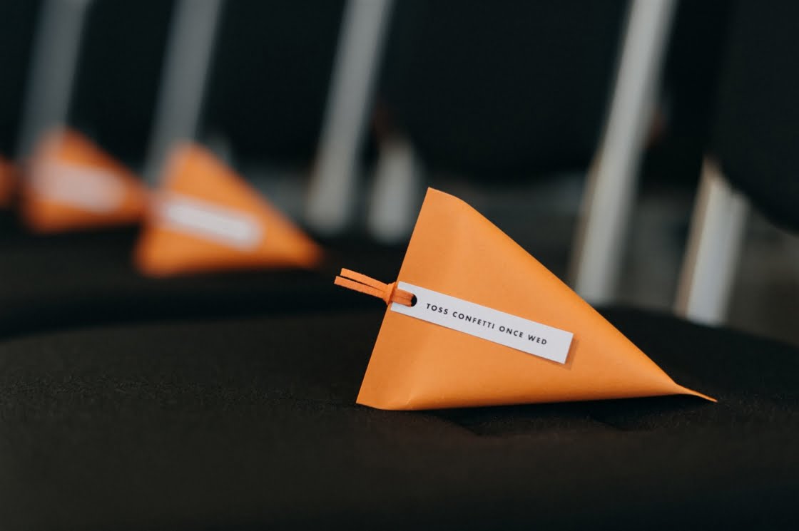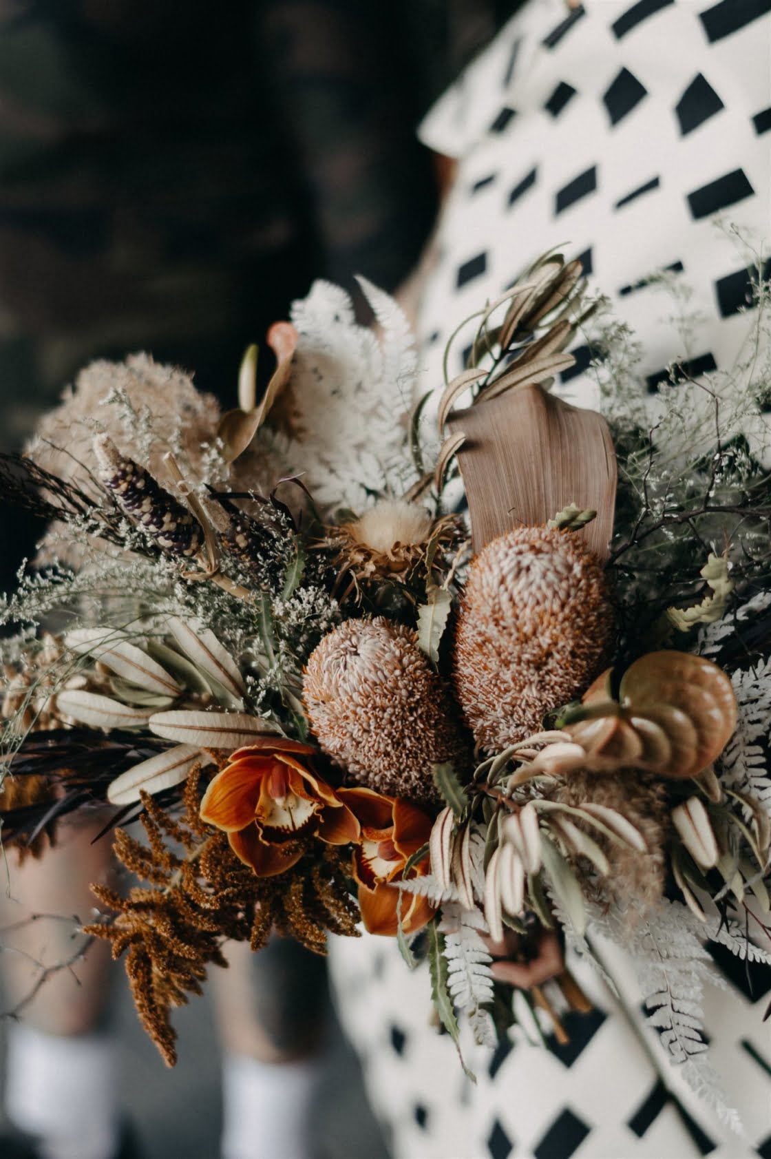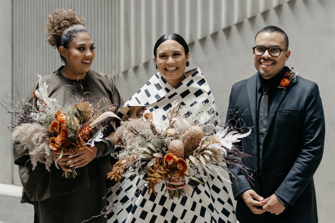 THE INSPO “Actually started from our choice in wedding outfits. Joel and I both chose our own wedding outfits which by chance both happened to be Comme des Garcons – Junya Watanabe designed pieces. From the sculptural shape of my dress and both having unique prints, I wanted to pay homage to that elevated Japanese fashion feel, so the theme was to incorporate fashion, art, design, and an earthy, tribal take on a modern bride/ wedding (which developed from my choice of reception outfit and jewellery for the day). Another theme we incorporated was warm/ Autumnal tones, which we chose to display through our florals, to work with our wedding suite (mandarin orange) colour palette and link these design elements together.”
