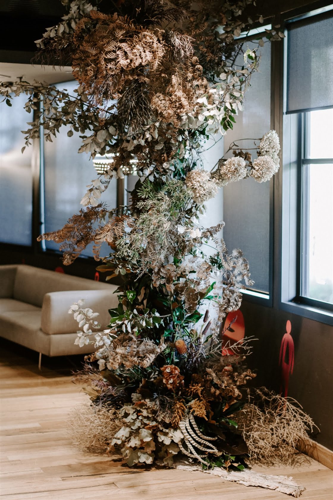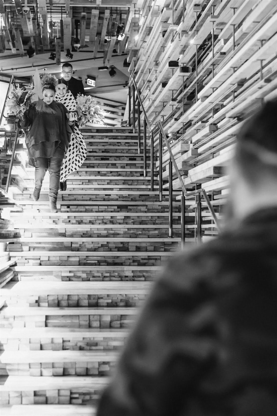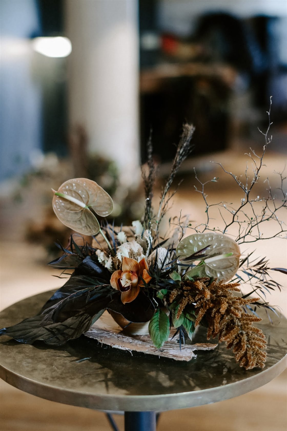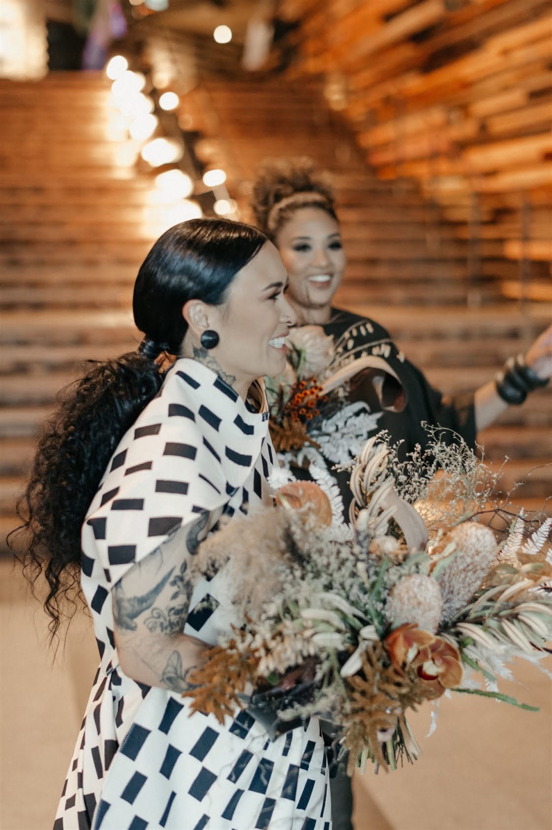 THE INSPO “Actually started from our choice in wedding outfits. Joel and I both chose our own wedding outfits which by chance both happened to be Comme des Garcons – Junya Watanabe designed pieces. From the sculptural shape of my dress and both having unique prints, I wanted to pay homage to that elevated Japanese fashion feel, so the theme was to incorporate fashion, art, design, and an earthy, tribal take on a modern bride/ wedding (which developed from my choice of reception outfit and jewellery for the day). Another theme we incorporated was warm/ Autumnal tones, which we chose to display through our florals, to work with our wedding suite (mandarin orange) colour palette and link these design elements together.”