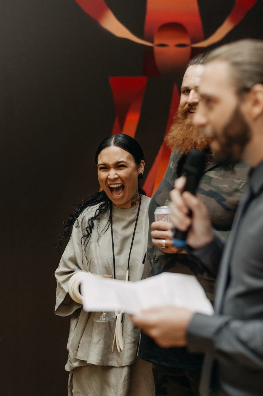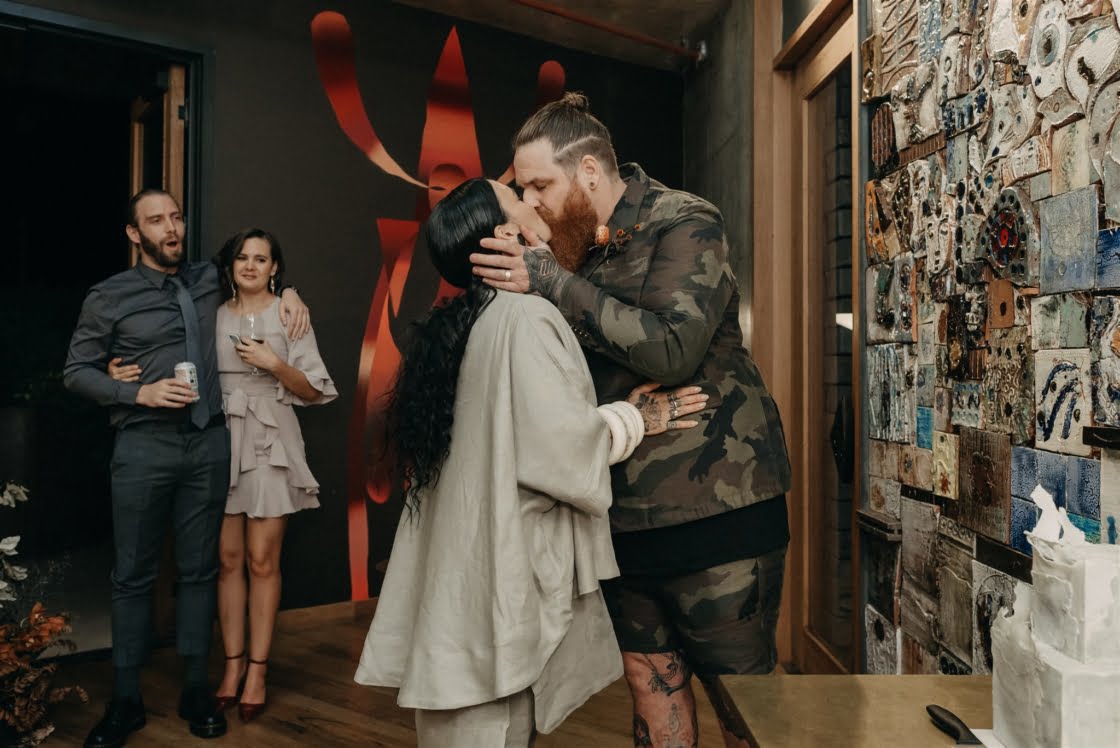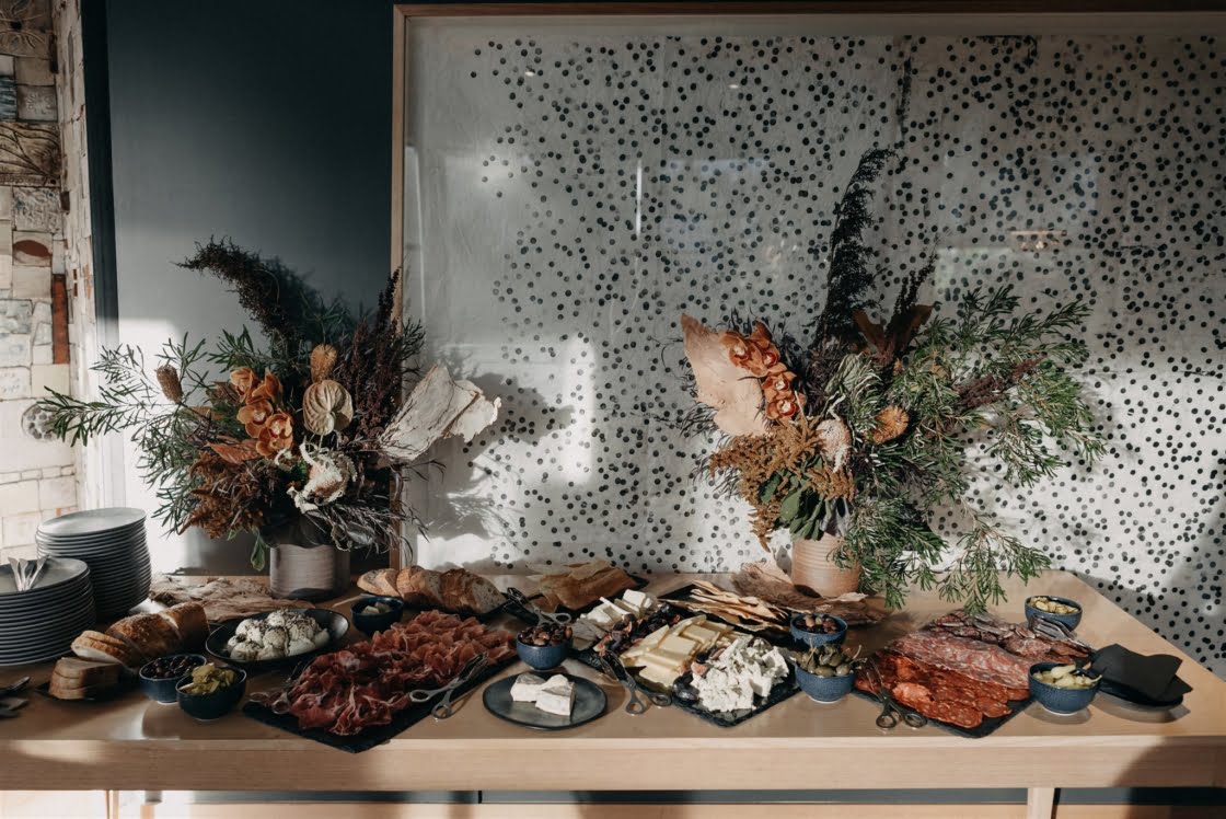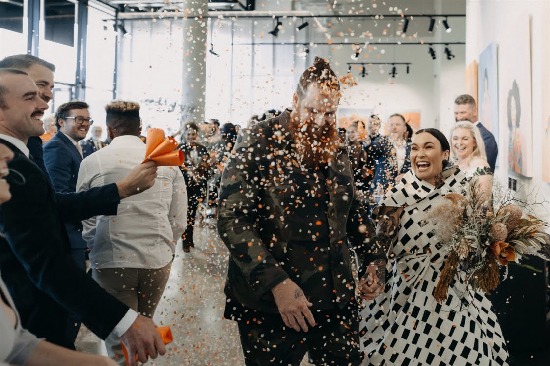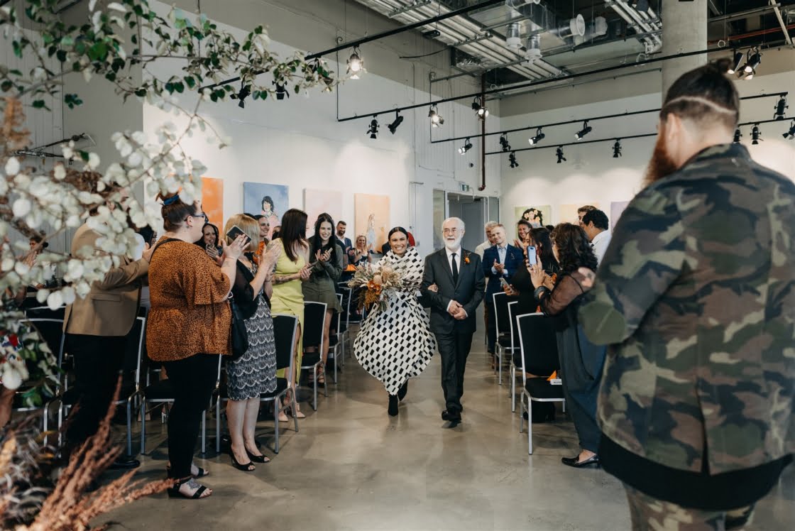 STANDOUT VENDORS “Laurel & Lace absolutely nailed our florals. We instantly connected. Viewing the gallery space together to discuss ideas turned into us grabbing a beer afterwards and chatting all things non-wedding for a few hours. I was truly blown away when I saw our bouquets, as they were better than anything I could have expected. It wasn’t just us that loved her work, we had so many compliments on the day and after the wedding about how amazing our floral arrangements were set up at both the gallery and reception space. Lauren Campbell, our photographer, was amazing – in the few days leading up to our wedding day when COVID space recommendations were first being mentioned and we didn’t know if our wedding would be able to go ahead. She was so accommodating. On the day she made us feel so comfortable and like a true photography magician, she was able to capture amazing moments without us even realising she was obviously there. Shannon O’Heir Marriage Celebrant was down from the onset to completely cater our ceremony to our needs, which for me was taking as much attention of us as possible. I didn’t want anything overly sentimental and she was able to make our ceremony completely light-hearted, full of laughs and had the brilliant idea of sharing stories about our bridal party so the spotlight was shared, which put me at ease. Our hands-down godsend was Elisa who was the gallery and events coordinator for aMBUSH Gallery in Canberra. [Also] Sam from Artforme Letterpress Studio, Saadia of La Ombre Creations was amazing.”