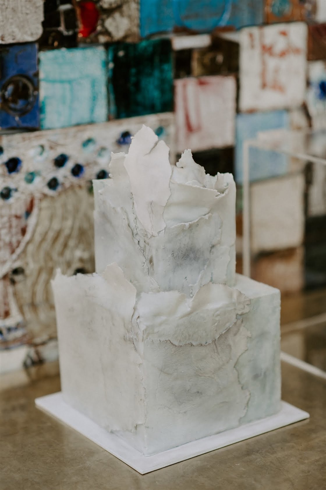 FAVE DETAILS “Definitely our invites. I studied graphic design, so designing and having the physical invite to send out to guests was an important aspect of the day to me, which ended up helping to create consistency between the invites and on the day. Another favourite detail on the day was our cake. I wanted the cake to match the art/design-focused theme I wanted to portray on the day, without being an obvious wedding cake. I knew I wanted a textural cake, with cement looking colours incorporated (so it was almost reminiscent of textural paintings) and I explained that brief with some inspo photos to La Ombre Creations, leaving the creative interpretation up to her. I still have friends to this day remind me of how amazing the cake was (both in flavour and visually).”