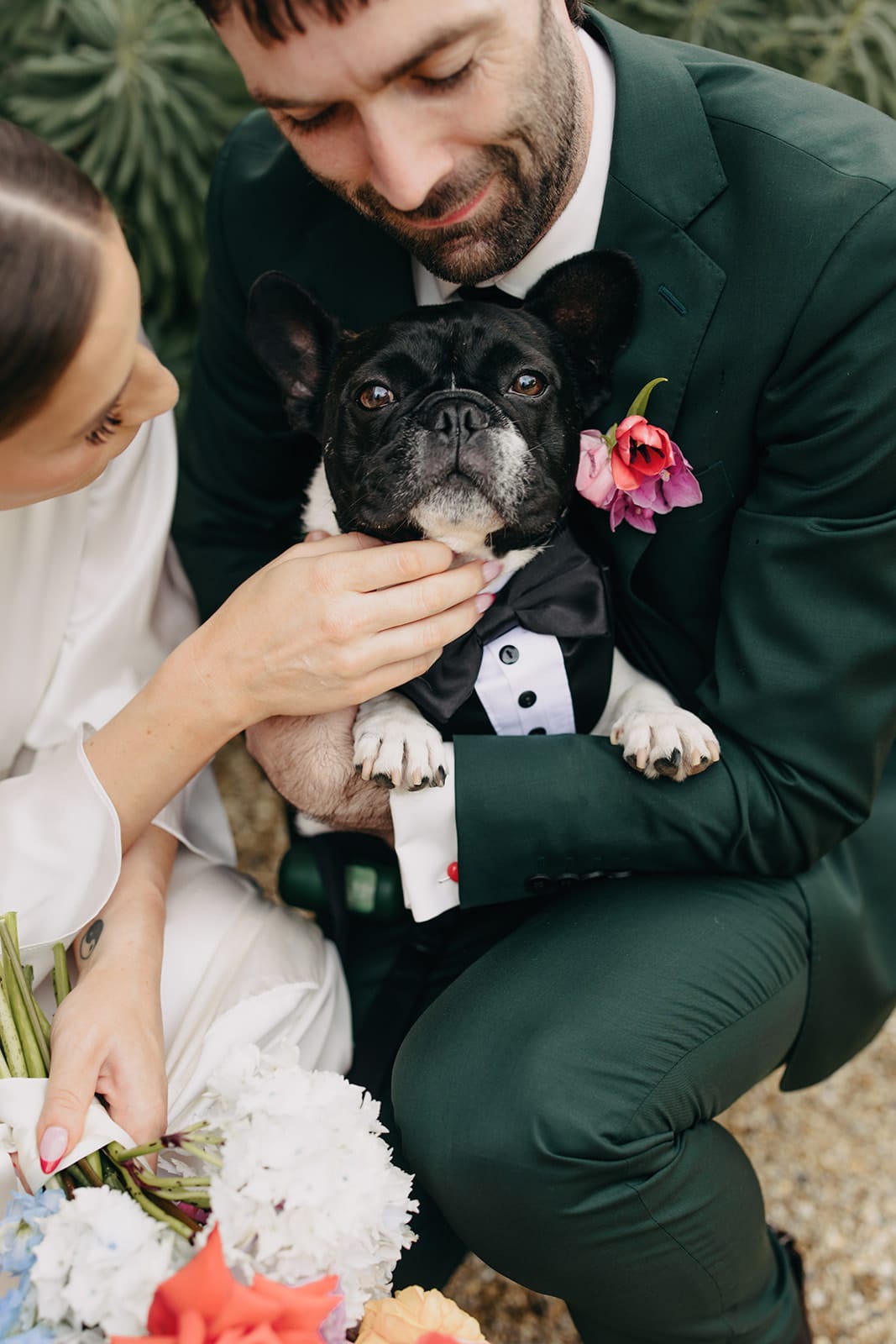 FAVE DETAILS “We loved all of our little odes to our ring boy (our beloved Frenchie, Louie). We had custom Louie coasters on the tables. We also had a ‘Louie’s recommendation’ on both the ceremony bar menu and the reception bar menu. We also just loved having him as part of our day—in his little tuxedo.”