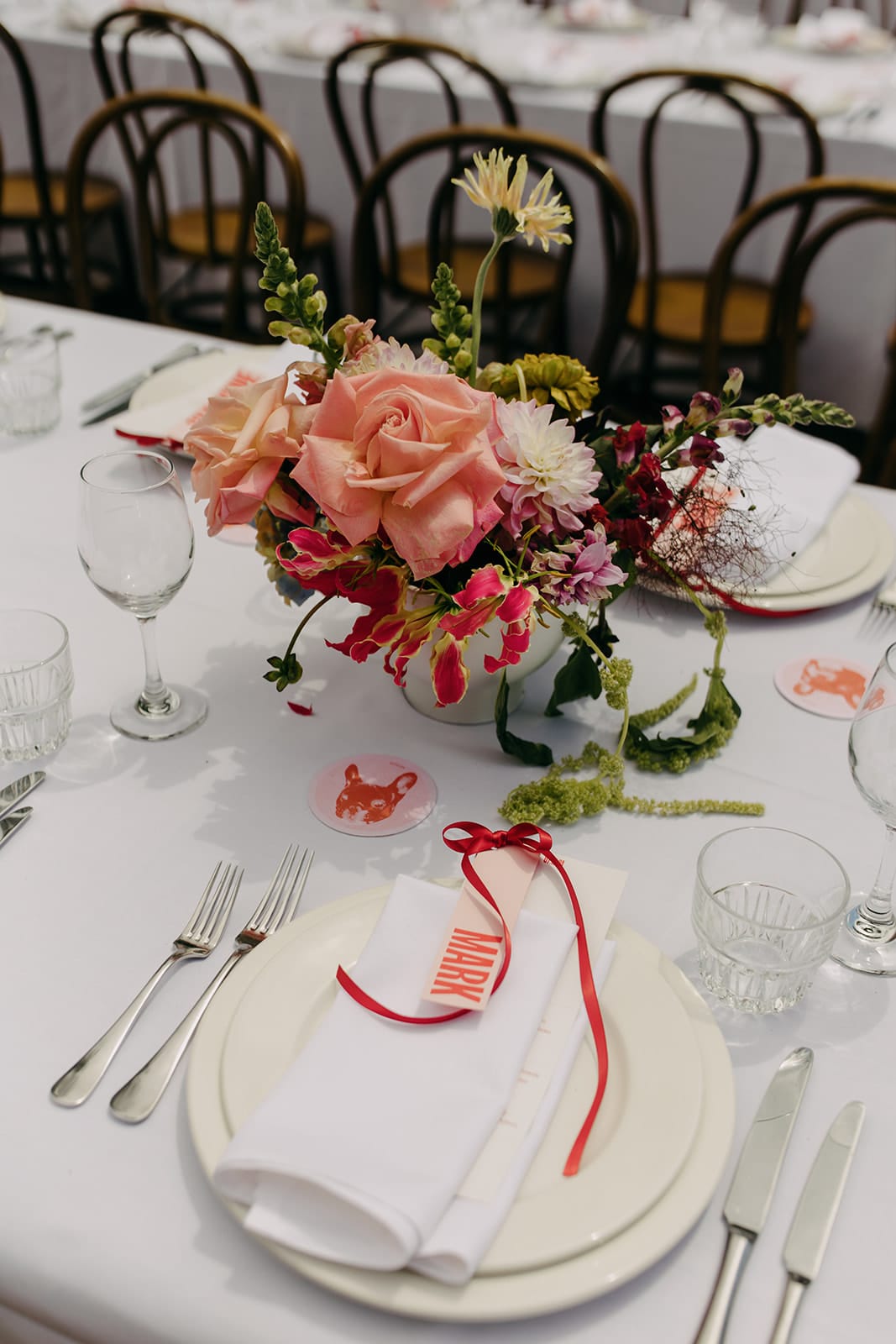 DIY “Since Declan is a graphic/digital designer by trade, he did all the stationery and [we] managed the printing ourselves. Whilst it was Dec who was on the tools, he was definitely heavily art directed by me – don’t think he would have come up with the pink and red colour palette without encouragement!!”