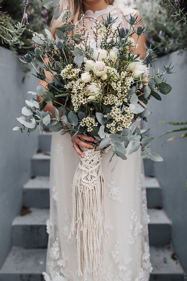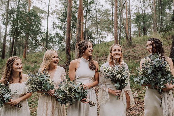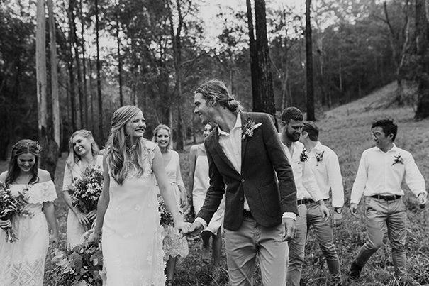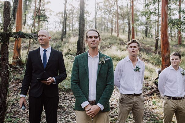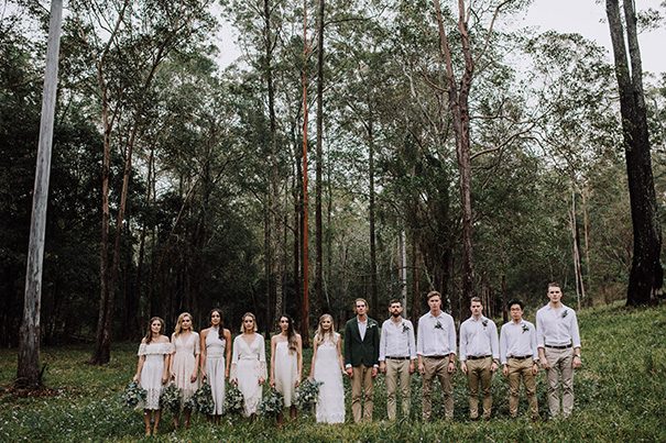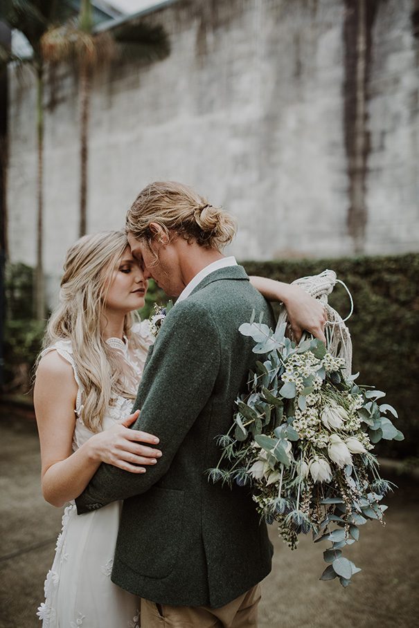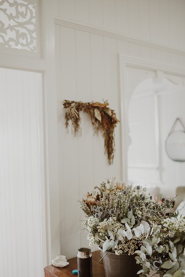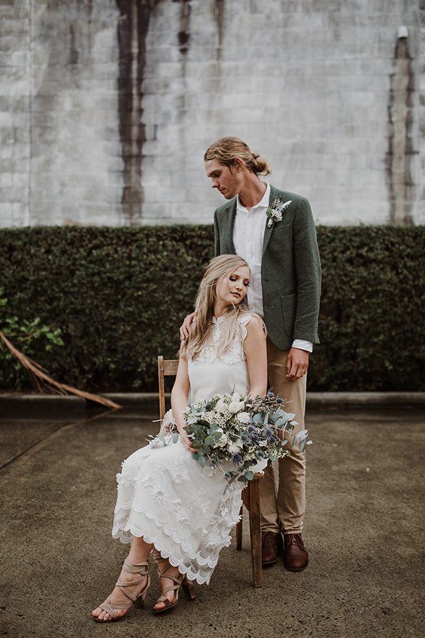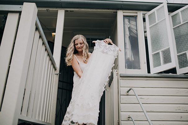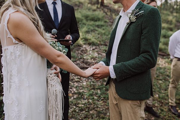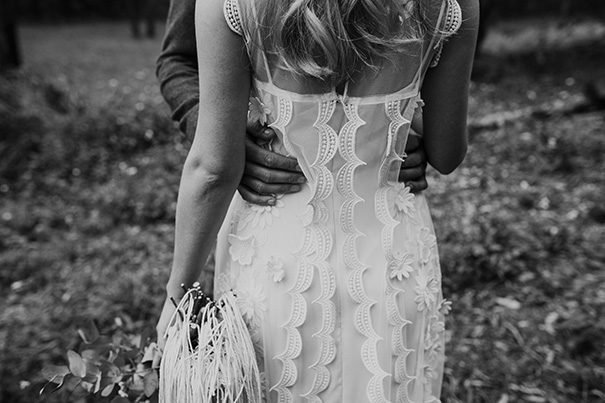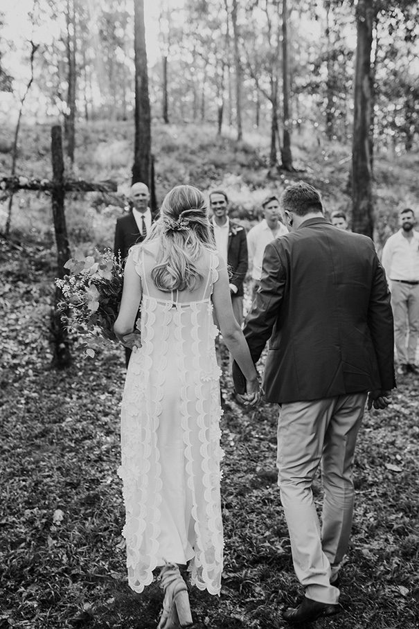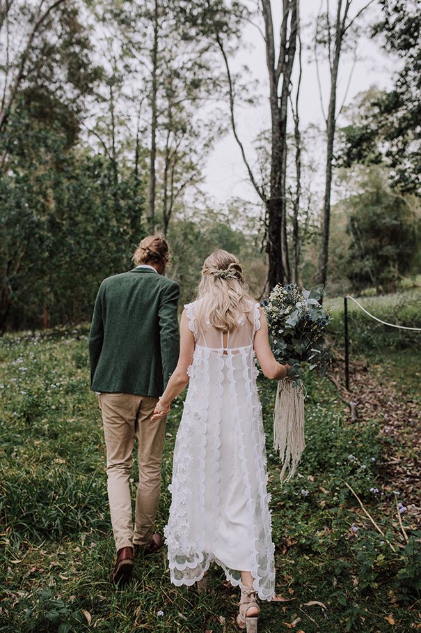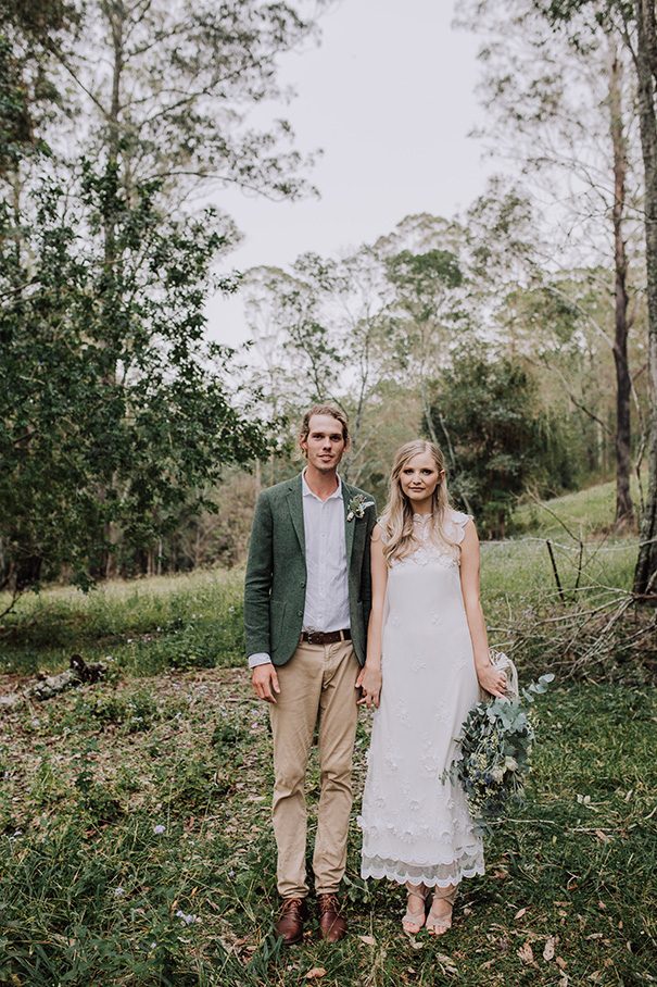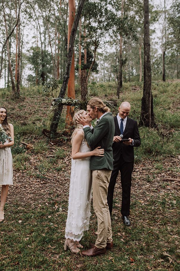 She goes on, “I loved all of our foliage and flowers. I bought heaps of flowers and cut down foliage and got a few of my girlfriends to decorate everywhere with it all (the log hanging above us, our chairs, the cross etc.).” In keeping with the casual vibes, Teags skipped out on visiting the usual go-around of bridal boutiques and instead opted for a vintage alternative.