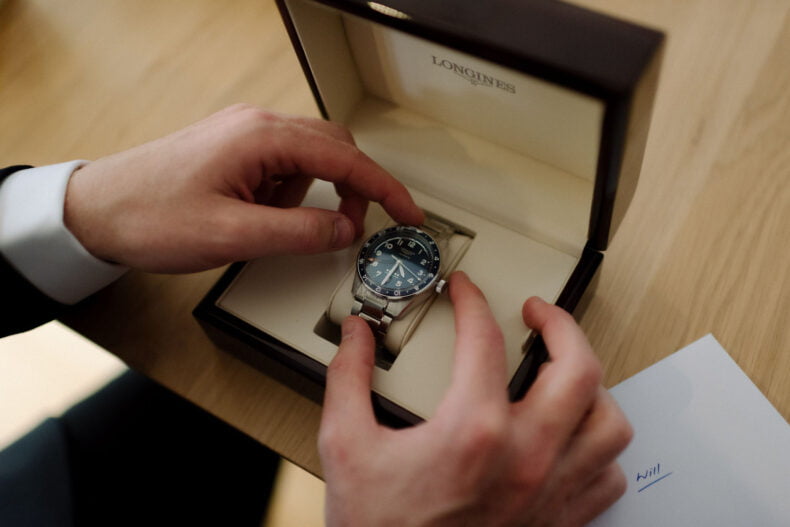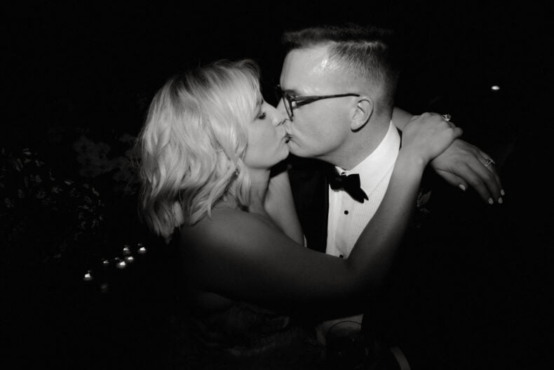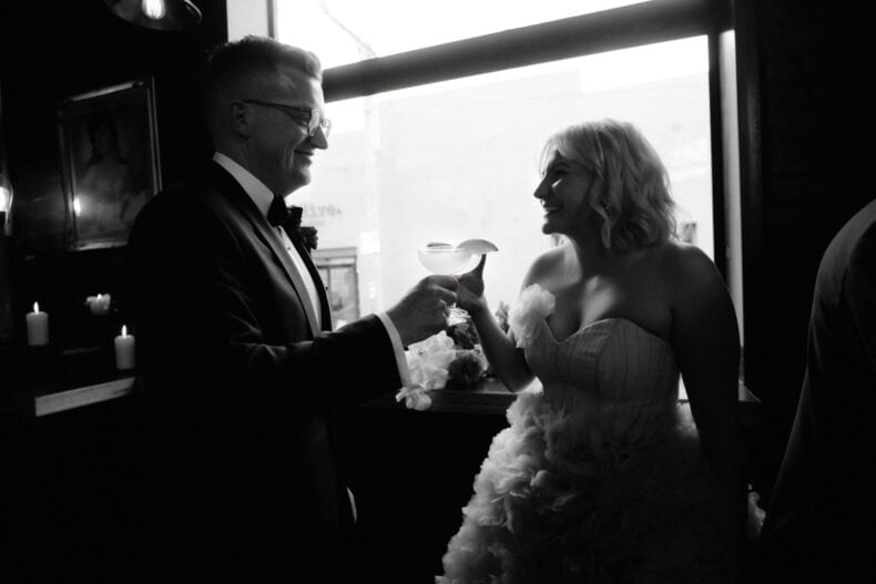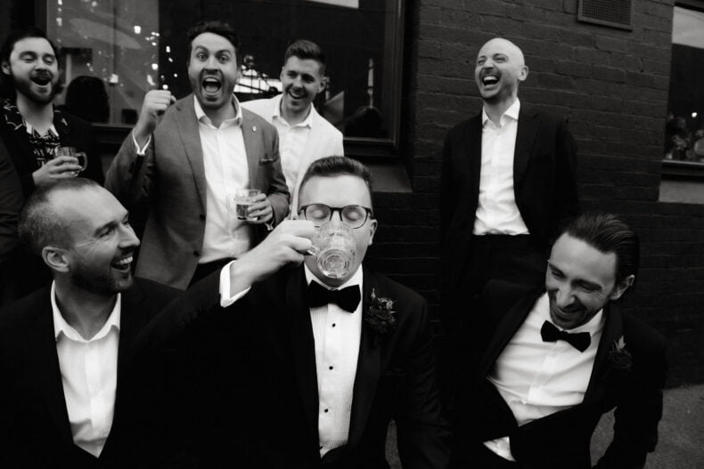 WE’RE GLAD WE… “Did first look drinks with the wedding party. Our decision to get together before the ceremony was three-fold. We couldn’t comprehend waiting all day to see each other, we wanted to surprise the wedding party and savour that moment together, and we wanted to get some of our photos taken pre-ceremony. So we got the wedding party together at Plug Nickel for pre-wedding cocktails. It was an incredibly special moment for the first look, and it took the nerves out of walking down the aisle. We also had our Beagiler pup, Alonso, get ready with Will the morning of the wedding, which meant that our photographer Lucy was able to capture some amazingly cute photos of them in matching bowties.”