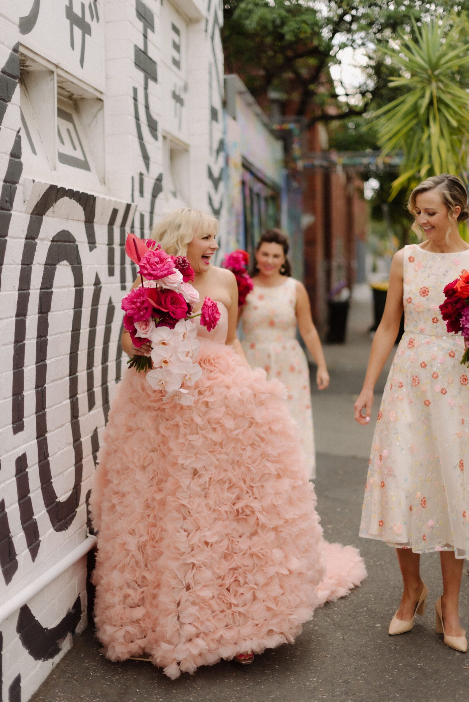 THE DRESS “I knew from the start that I wanted to do something different. I am incredibly passionate about colour and couldn’t envision wearing white. I saw the ‘Rose’ gown from Couture + Love + Madness online and fell in love (even more so than with Will *wink*). The style and colour were perfect for me. Mum, my sister, and I travelled to Adelaide to meet Cristina from Couture + Love + Madness, and she was an absolute dream to work with. During this visit, we found the bridesmaids’ dresses that would tie in with the theme. I also decided to have my niece, Peyton, in a dress that matched the girls’.”