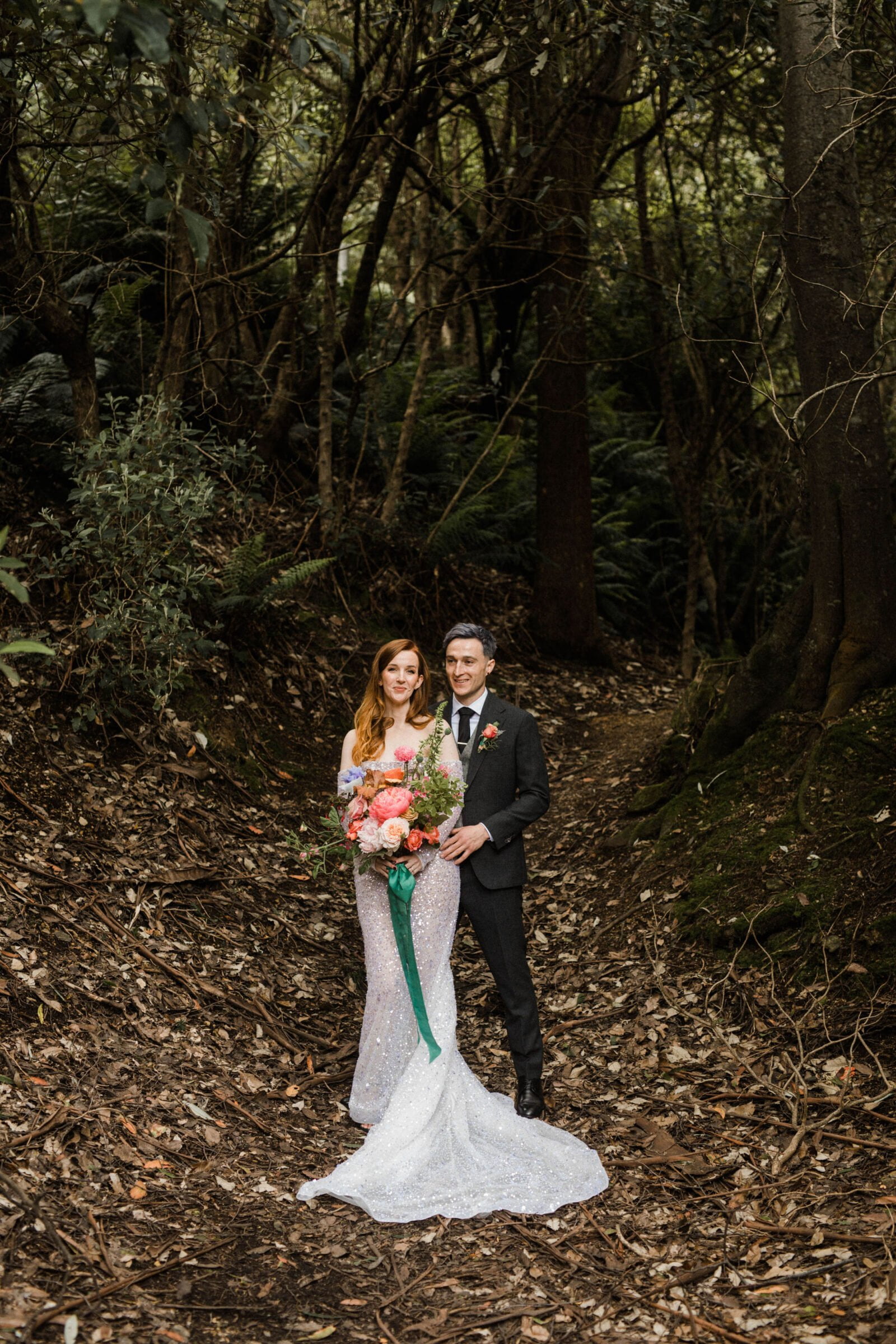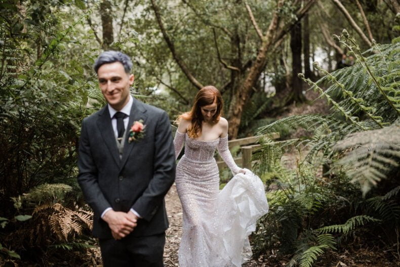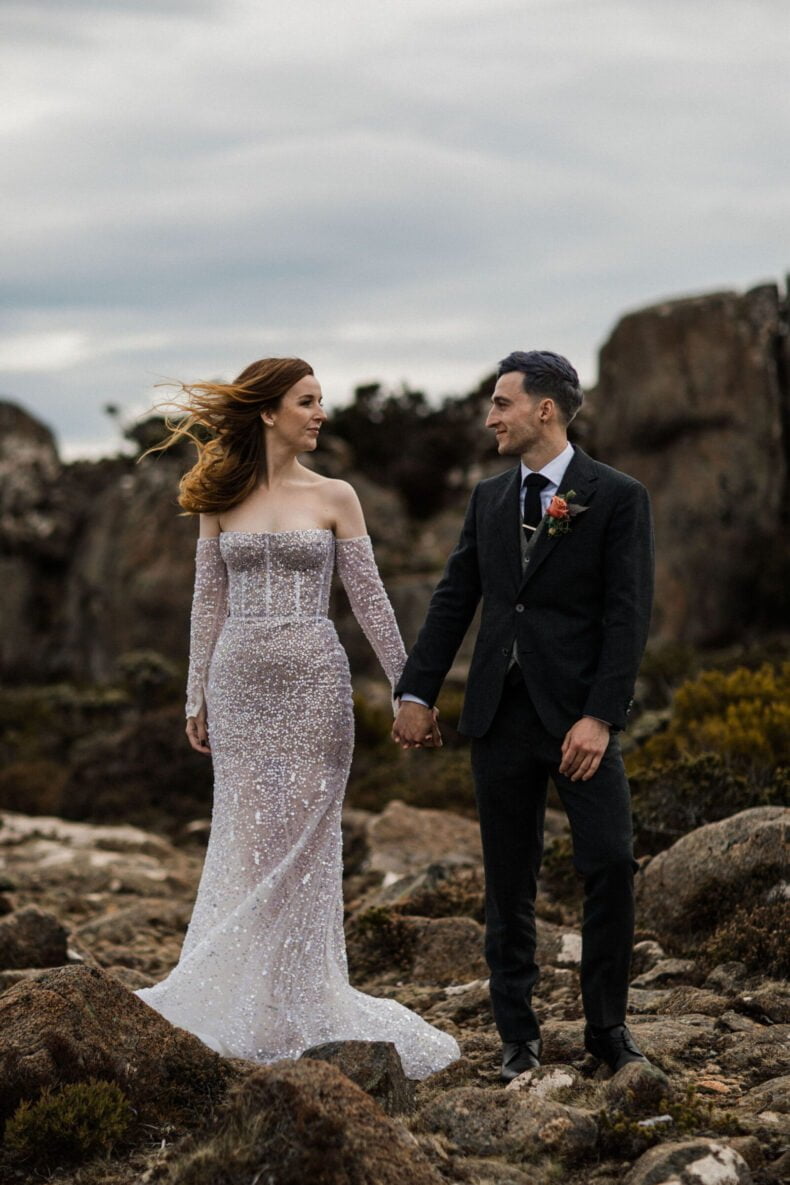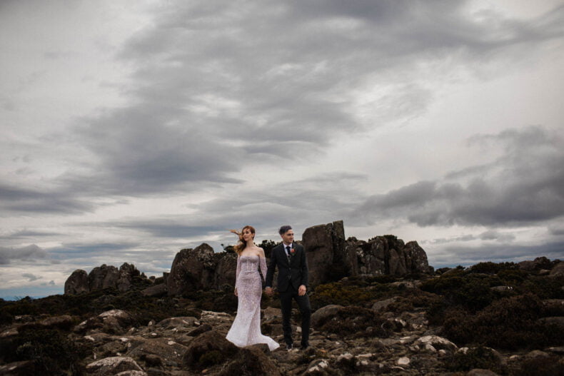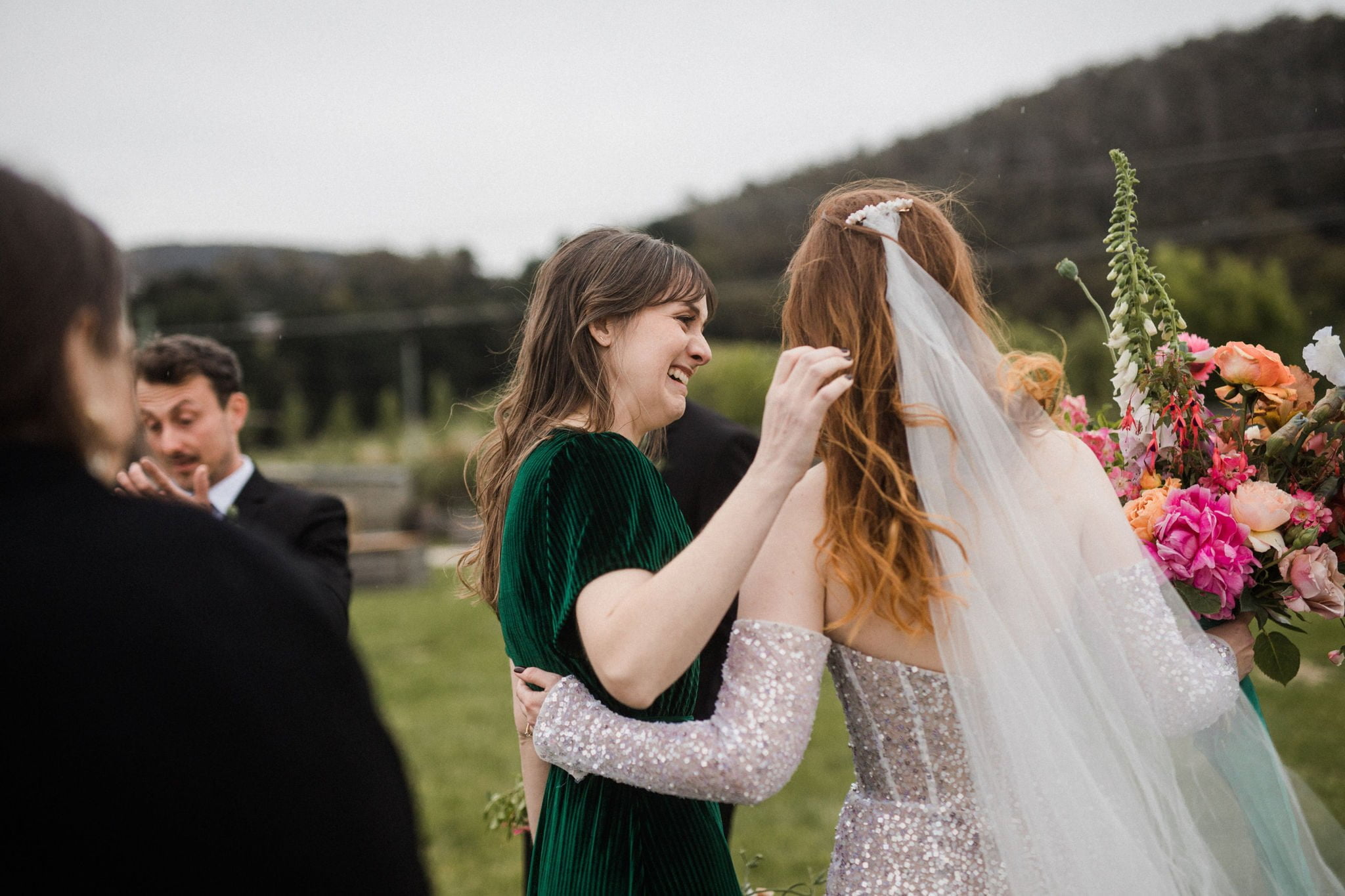WE’RE GLAD WE… “We did our portraits before the ceremony. The day felt so surreal when the morning came, but after doing the first look photos, we were zooming up kunanyi [Mount Wellington] in a van with our best friends (all looking incredible). It was honestly just such a nice time and so grounding, and took all the nerves out of the day. Taking our portraits beforehand also meant that directly after the ceremony, we could just get into the celebration with everyone and have so much more time with our guests. It’s not for everyone, but it just created such a nice rhythm for the evening for us and gave us extra time with our loved ones who had travelled so far to be with us. Despite taking photos for a couple of hours before the ceremony, we still did the big reveal of me walking up the aisle and I’m glad we still included that. I know from weddings I’ve attended, that first moment of the couple seeing each other at the aisle is just so special, so we didn’t want to skip past that even though we’d already seen each other in our finery. I did have a secret three-metre-long Cathedral veil, that Joe didn’t know about, that I clipped in for the ceremony. I felt like that helped give the moment a bit of a ‘reveal’ element for him as well, and with the wind, it certainly brought the drama.”