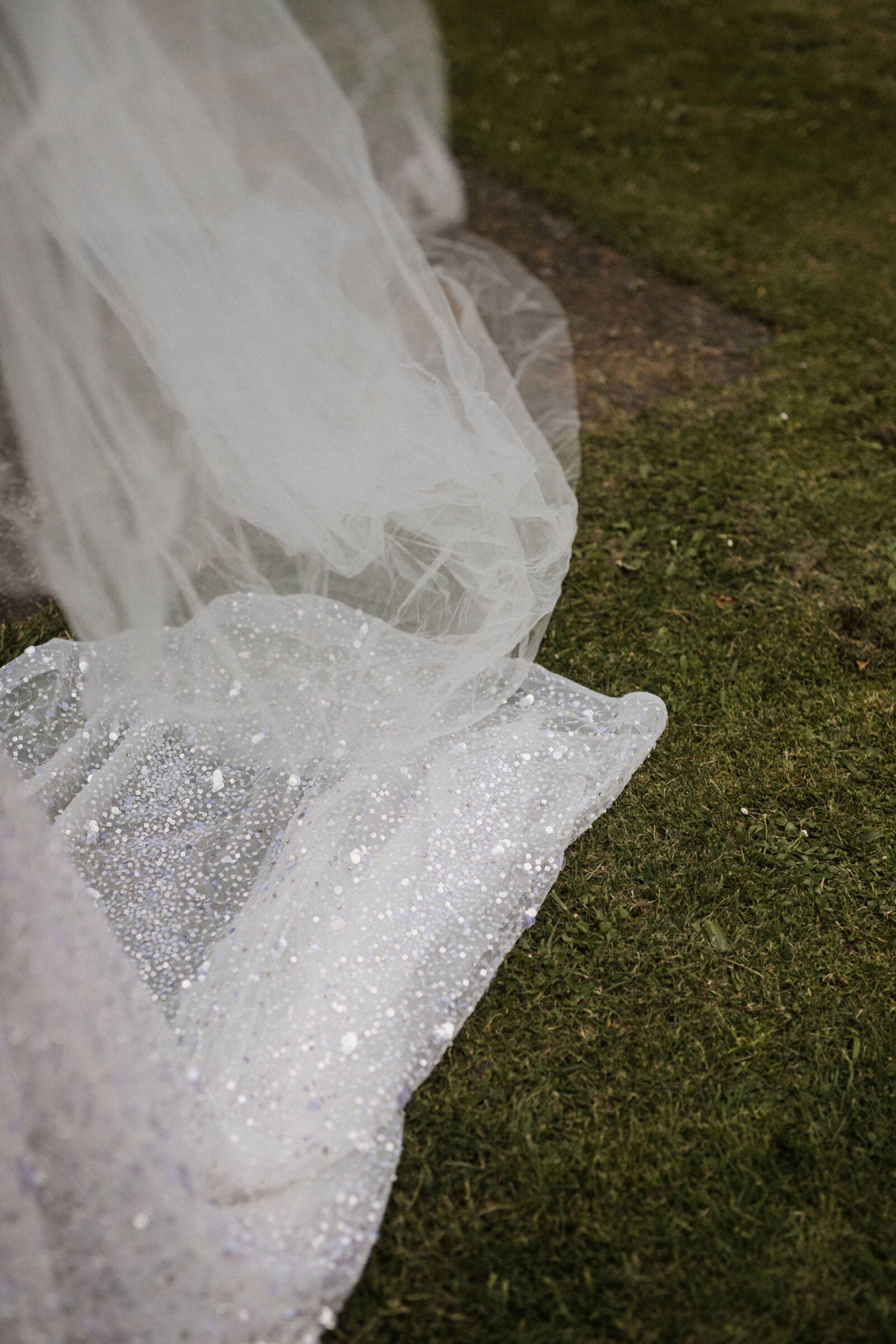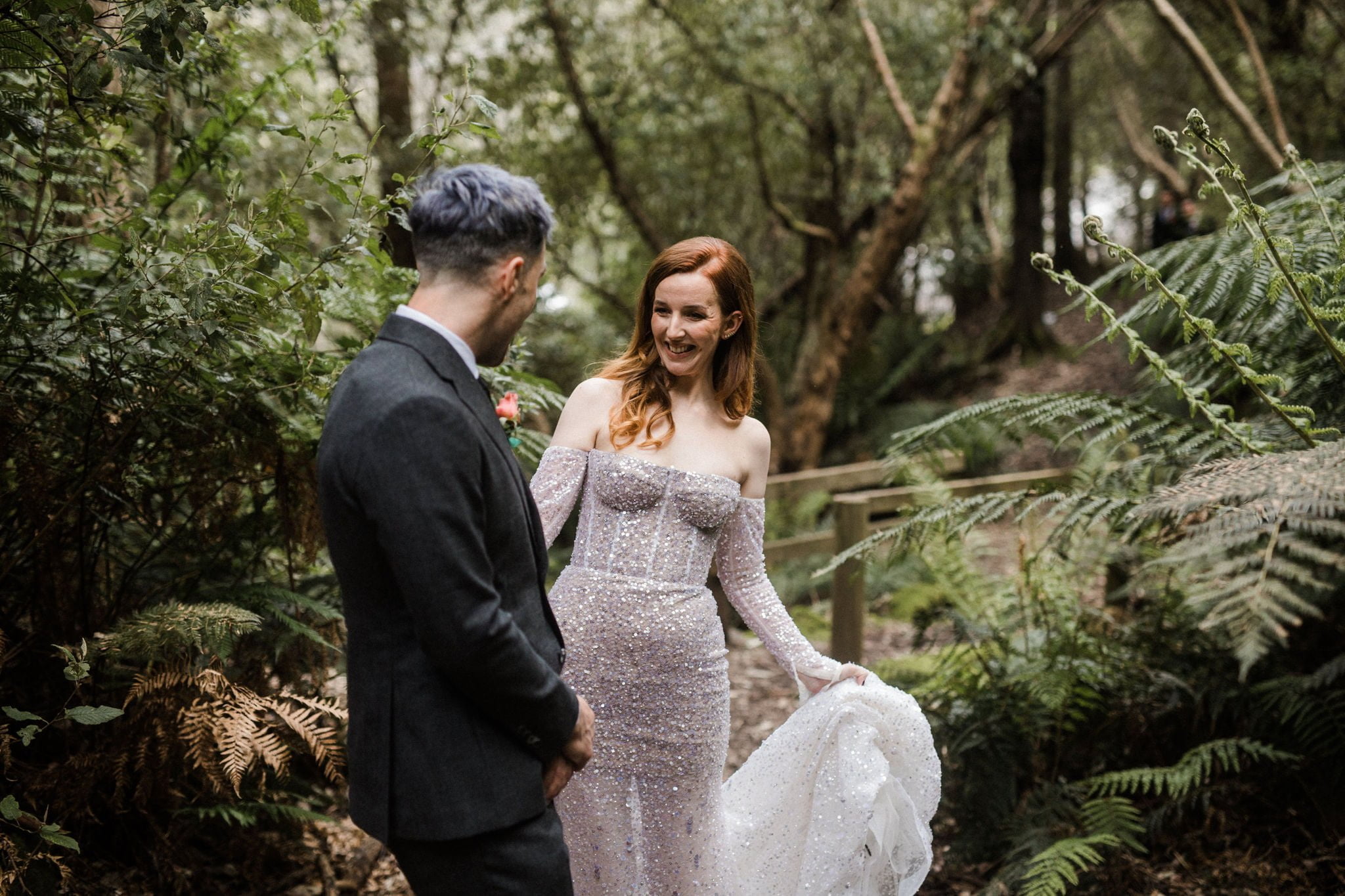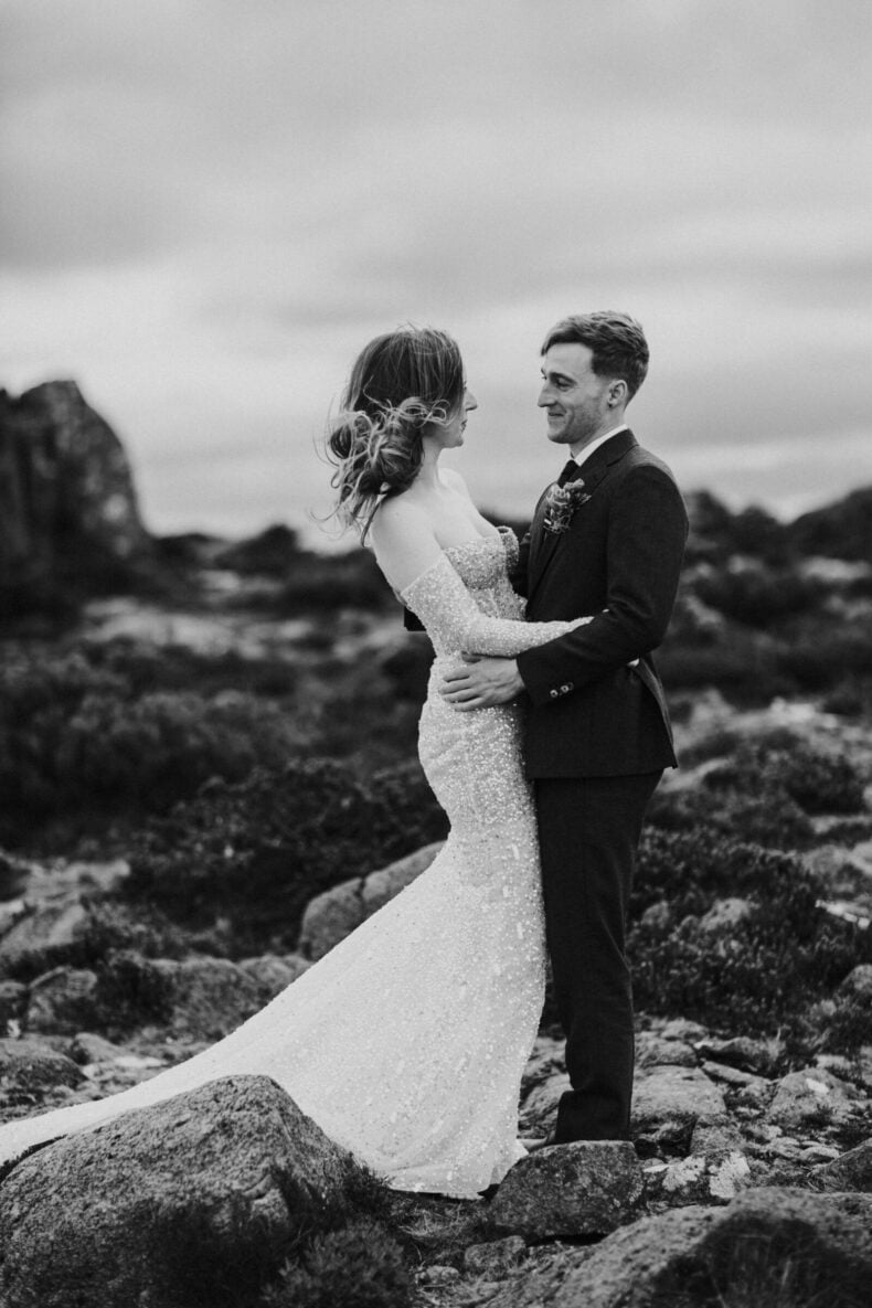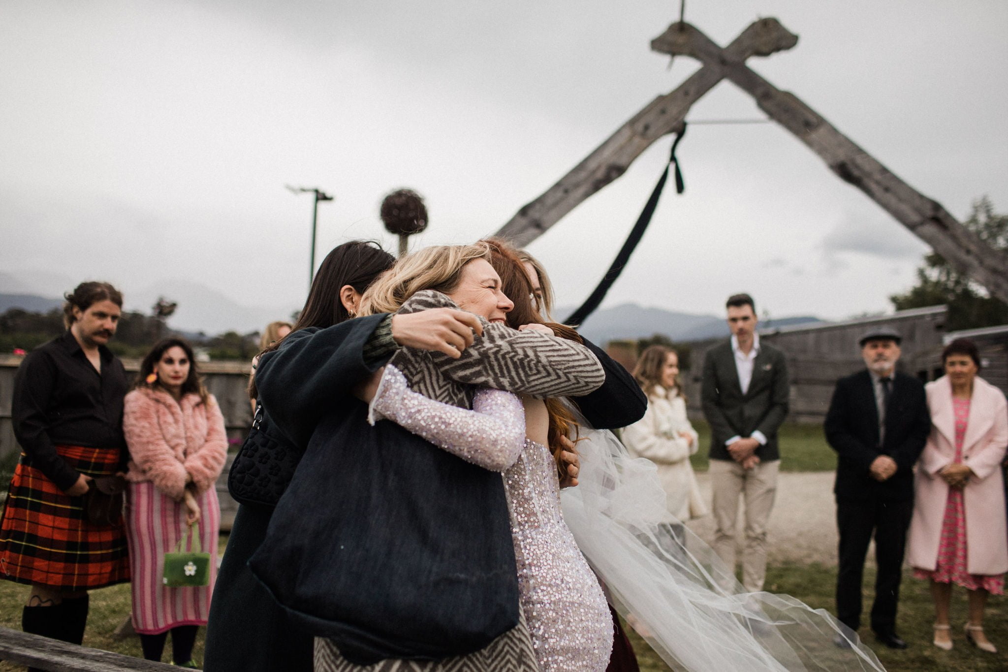 WE’RE GLAD WE… “We did our portraits before the ceremony. The day felt so surreal when the morning came, but after doing the first look photos, we were zooming up kunanyi [Mount Wellington] in a van with our best friends (all looking incredible). It was honestly just such a nice time and so grounding, and took all the nerves out of the day. Taking our portraits beforehand also meant that directly after the ceremony, we could just get into the celebration with everyone and have so much more time with our guests. It’s not for everyone, but it just created such a nice rhythm for the evening for us and gave us extra time with our loved ones who had travelled so far to be with us. Despite taking photos for a couple of hours before the ceremony, we still did the big reveal of me walking up the aisle and I’m glad we still included that. I know from weddings I’ve attended, that first moment of the couple seeing each other at the aisle is just so special, so we didn’t want to skip past that even though we’d already seen each other in our finery. I did have a secret three-metre-long Cathedral veil, that Joe didn’t know about, that I clipped in for the ceremony. I felt like that helped give the moment a bit of a ‘reveal’ element for him as well, and with the wind, it certainly brought the drama.”
