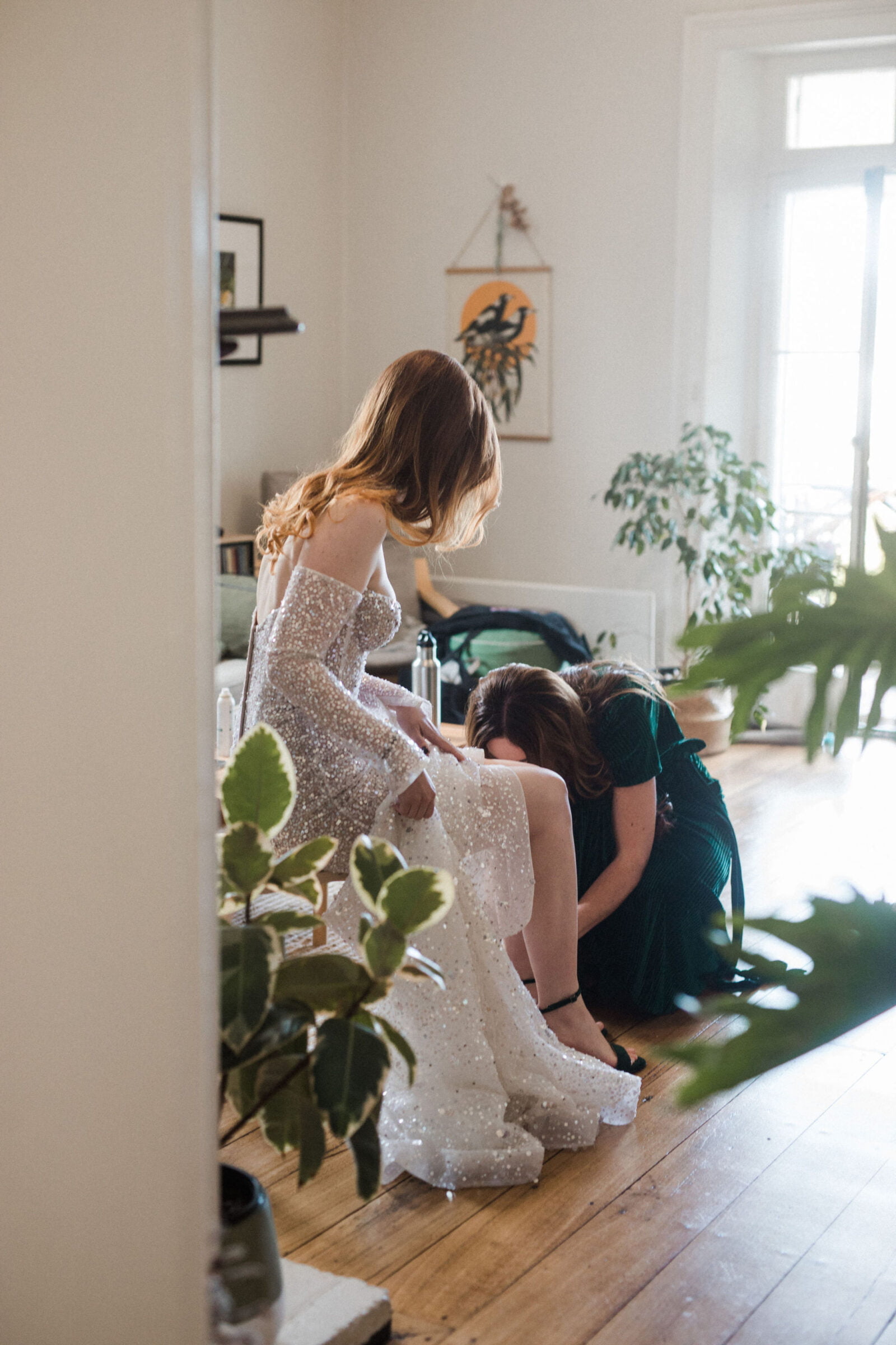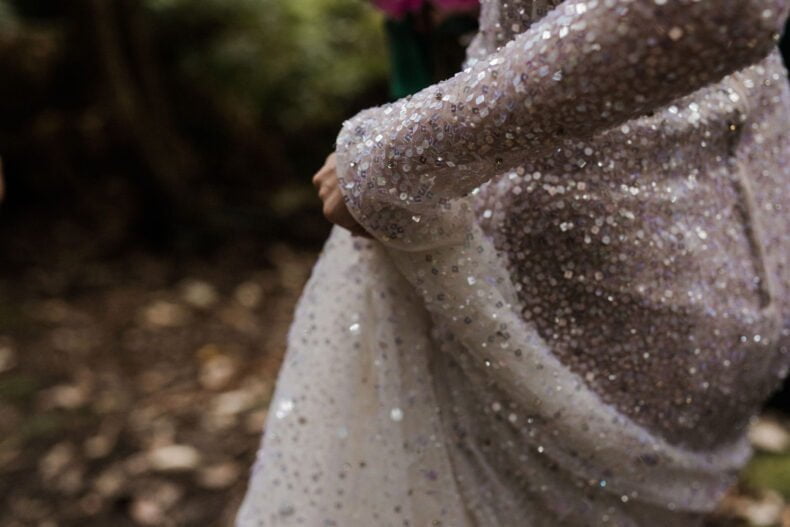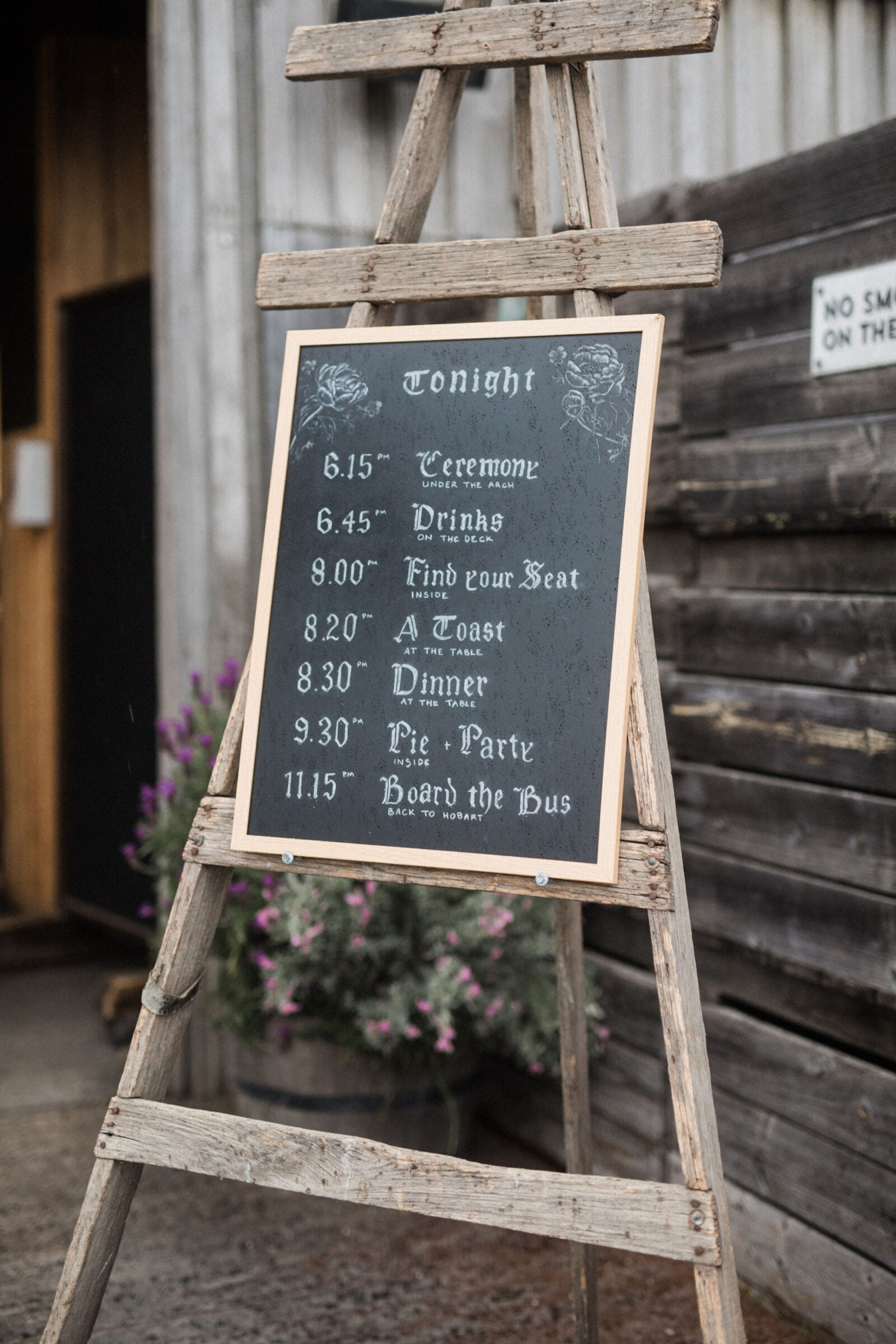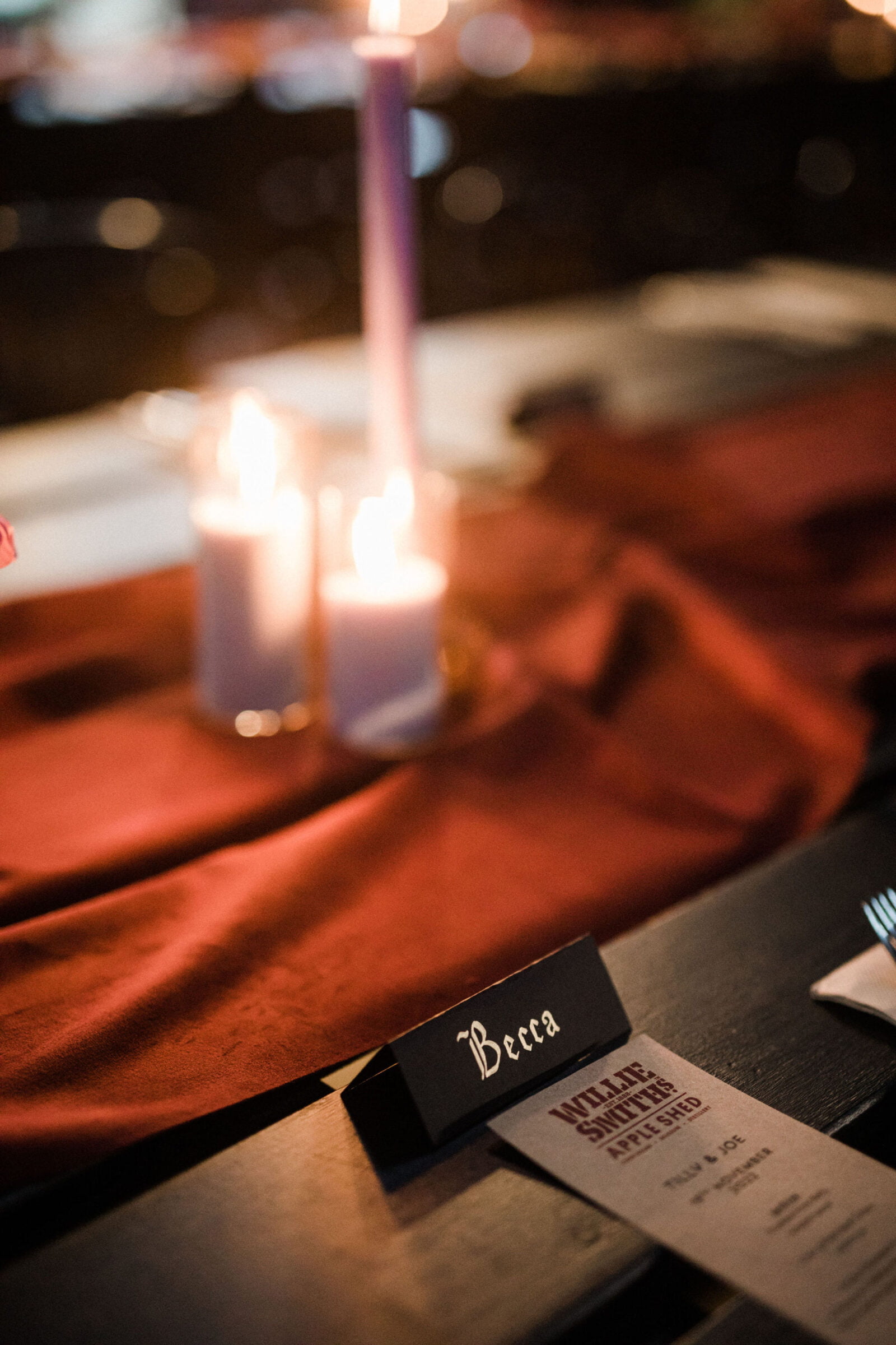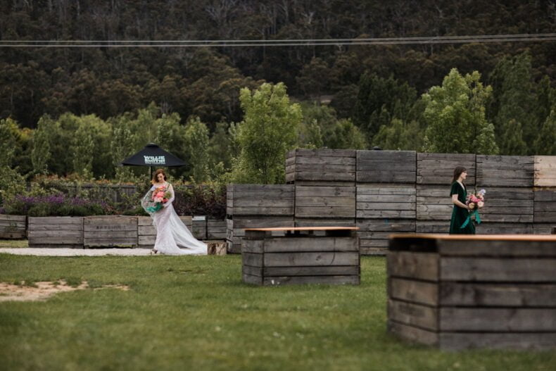 MEMORABLE MOMENT “Walking down the aisle and our ceremony were my favourite parts of the day. My bridesmaids and I had been hiding in the orchard, sipping some calming ciders, getting more and more nervous hearing the sound of everyone getting off of the bus. When the music we had chosen finally swelled up we hit our walk-out cue. Rounding the apple crates and finally seeing everyone’s faces just hit me right in the heart. Here were all of the most special people in our lives who had travelled from all over and gathered together for us. I lost it a bit at Joe getting emotional too as I made my way up to the arch. The whole ceremony was so full-on and beautiful, very emotional and raw, and everyone there was just with us at every word. The weather rose to the occasion, with the wind picking up and a dark cloud rolling over the mountain range. The drama of the weather definitely added to the emotional rush of everything and we managed to just get through the ceremony and sign our papers before the sky broke open. The first little droplets of rain that smudged out some of the calligraphy on our wedding certificate are one of my favourite details from the day – a tiny souvenir of the epic afternoon.”