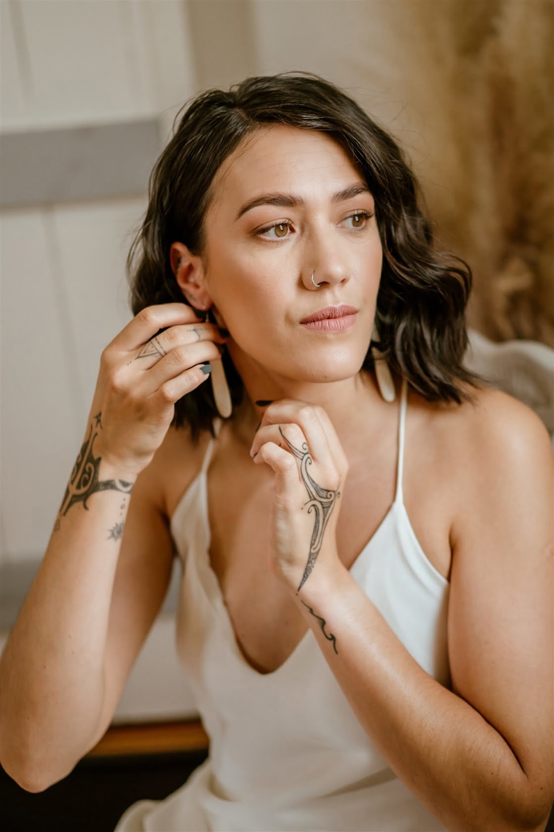 THE DRESS “I love my dress so much! I went to Grace Loves Lace and found it straightaway. It was so comfy! I could dance in it and even ride the mechanical bull we had there. It’s quite simple, which is exactly what I wanted because I wanted my kakahu (feathered cloak) to be the main piece and I knew they would complement each other.”
