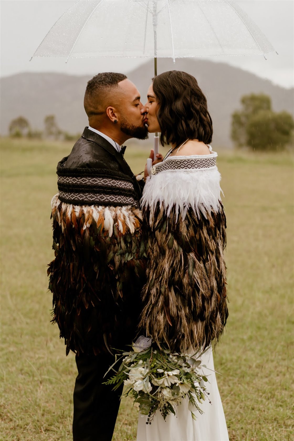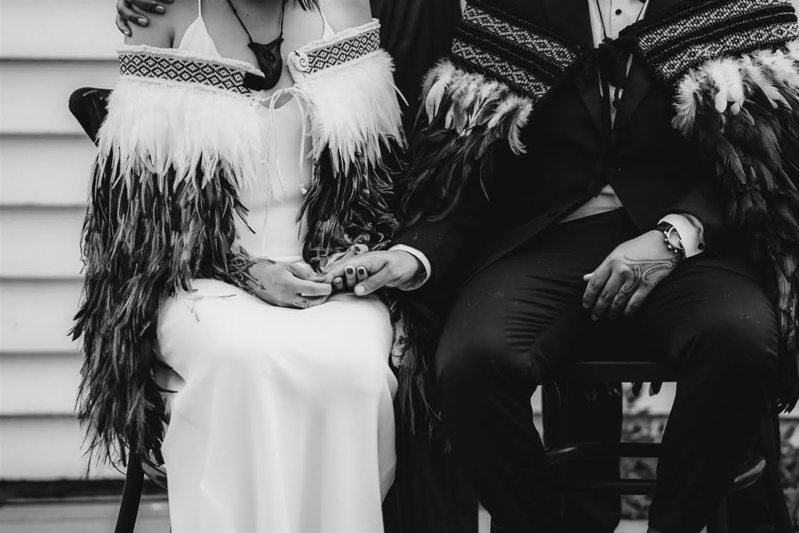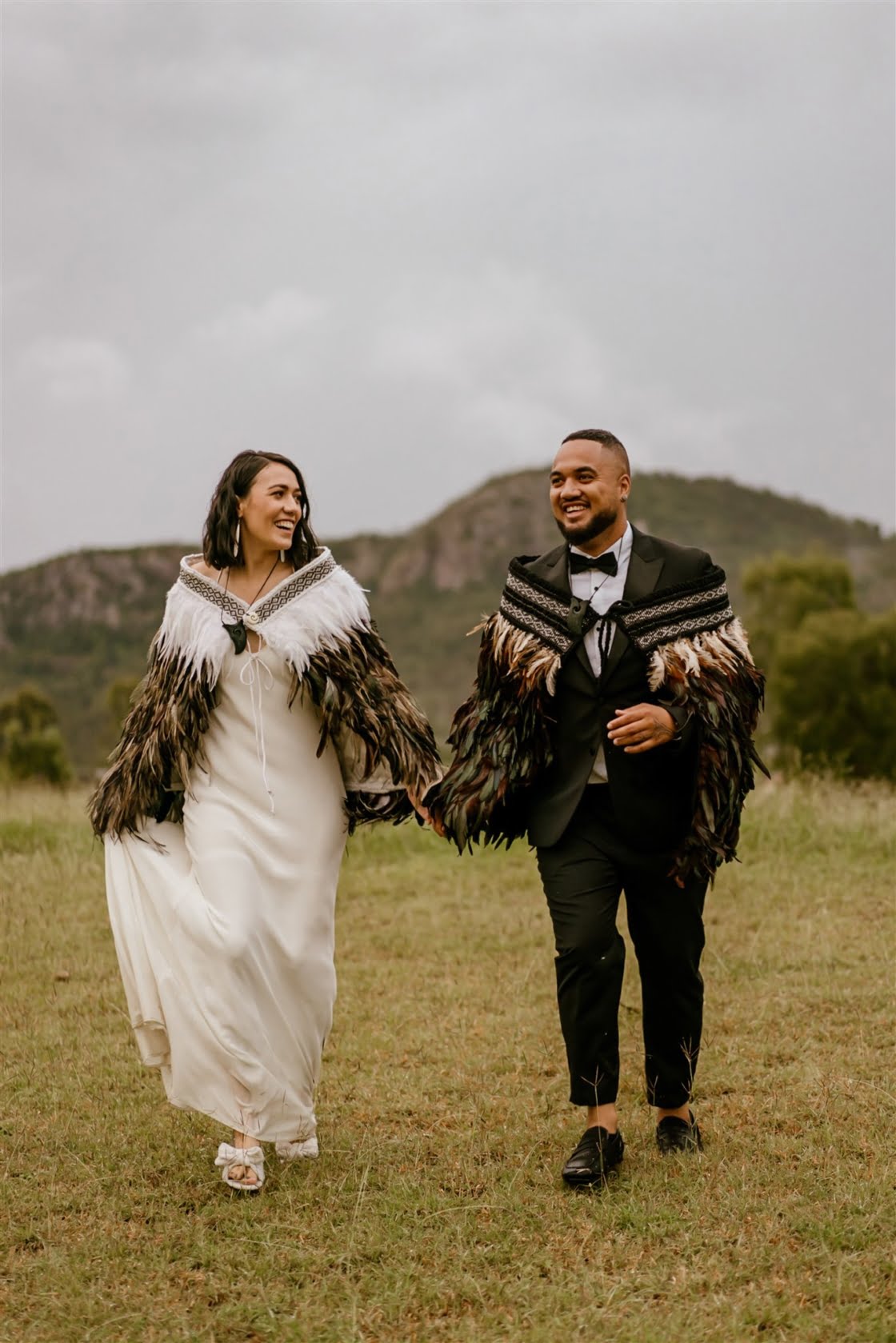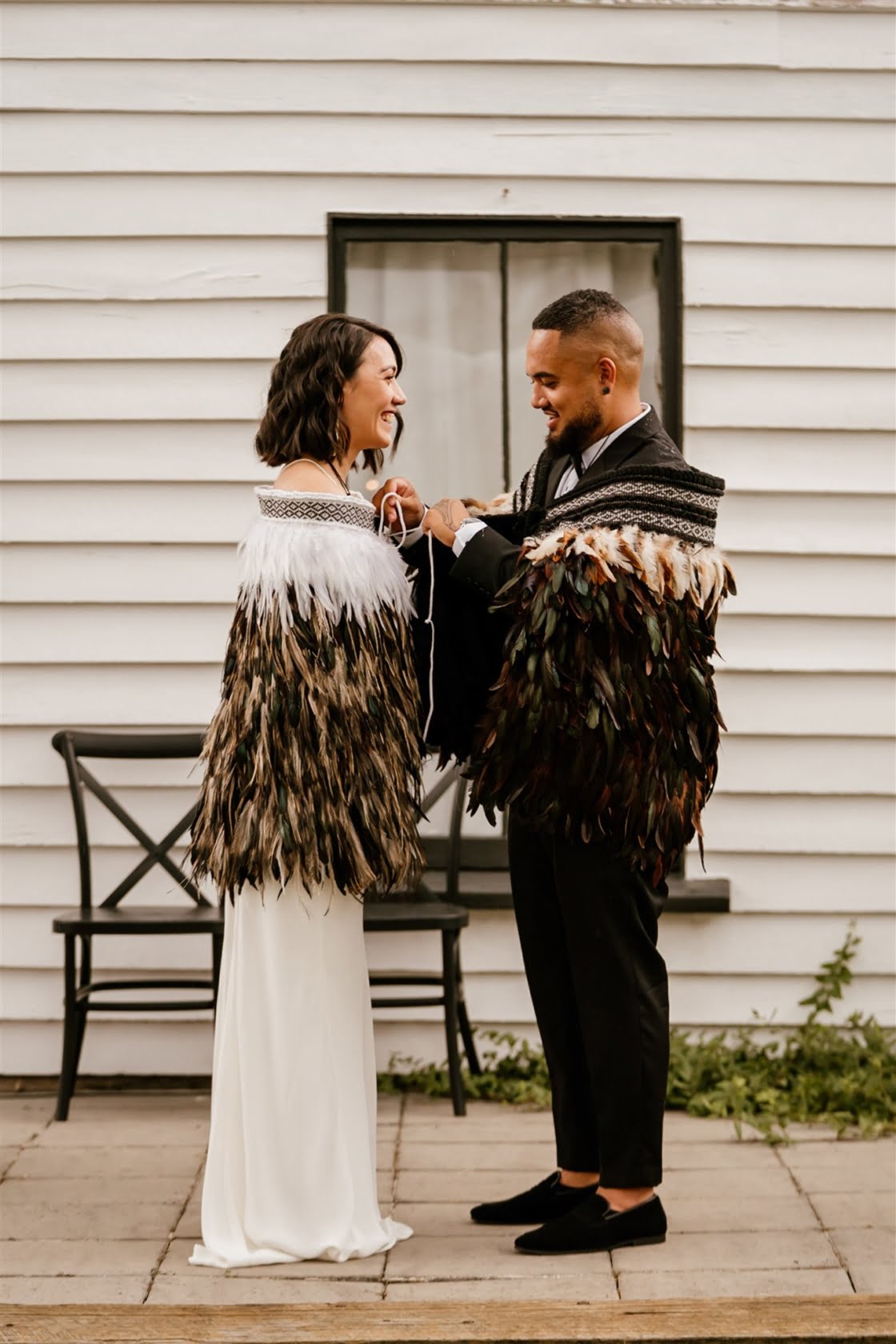 TAKE ON TRADITION “Our two favourite things were our custom pounamu (pendants) and kakahu (cloaks) that we exchanged on the day. Our pounamu were custom-carved back in New Zealand and tell the story of us both as individuals and together as a couple. We decided to exchange these as we had decided the get traditional ta moko tatau (tattoo) as our wedding bands but still wanted something to wear and exchange. Before we said our vows we had our pounamu passed around to guests to ‘warm’ by rubbing them. The jade absorbs your natural oils and in a way the oils are polishing it. It means that everyone who touches our pounamu is with us in some way. Our traditional kakahu (cloaks) were extra special as they were woven by our mums. They are normally presented at the end of the ceremony as a final declaration of love, and symbolise each of us wrapping and protectecting our new spouse.”