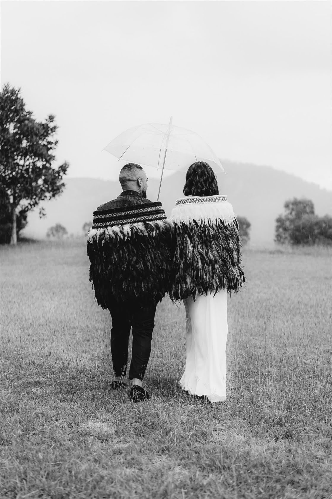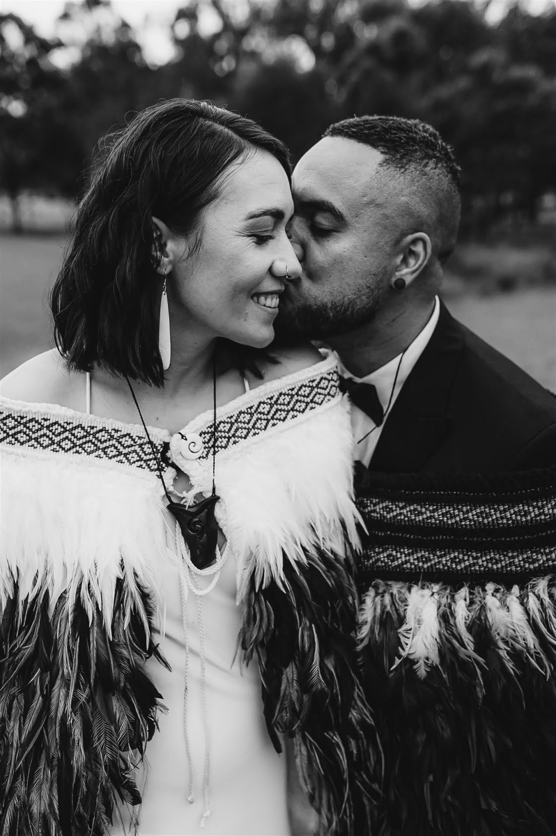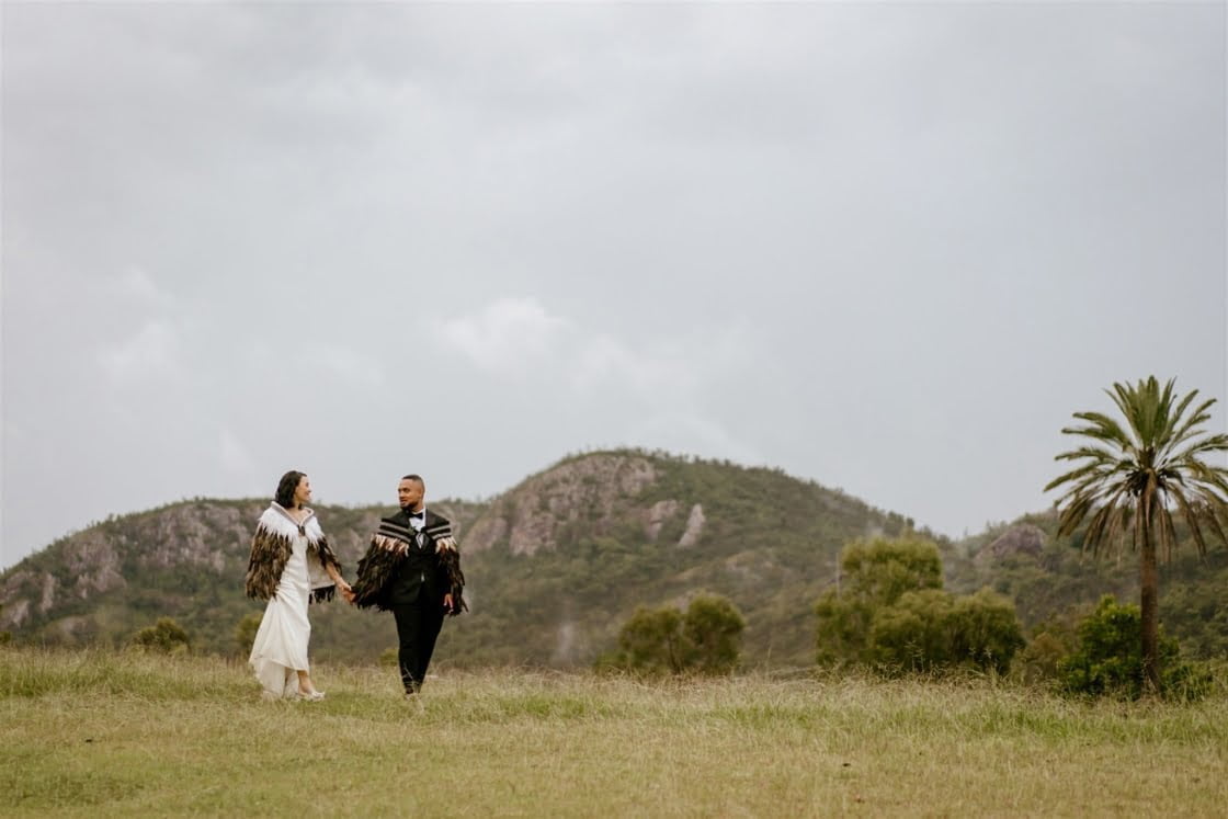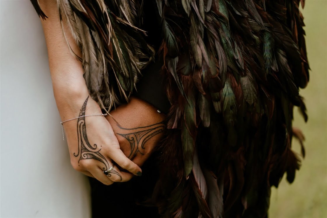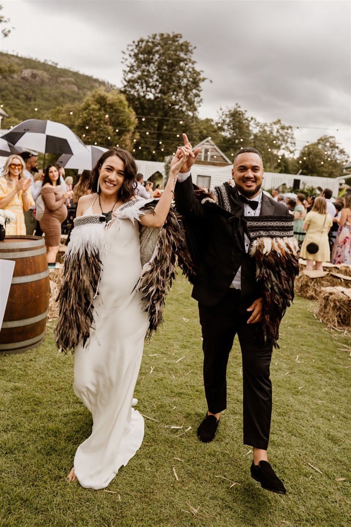 TAKE ON TRADITION “Our two favourite things were our custom pounamu (pendants) and kakahu (cloaks) that we exchanged on the day. Our pounamu were custom-carved back in New Zealand and tell the story of us both as individuals and together as a couple. We decided to exchange these as we had decided the get traditional ta moko tatau (tattoo) as our wedding bands but still wanted something to wear and exchange. Before we said our vows we had our pounamu passed around to guests to ‘warm’ by rubbing them. The jade absorbs your natural oils and in a way the oils are polishing it. It means that everyone who touches our pounamu is with us in some way. Our traditional kakahu (cloaks) were extra special as they were woven by our mums. They are normally presented at the end of the ceremony as a final declaration of love, and symbolise each of us wrapping and protectecting our new spouse.”