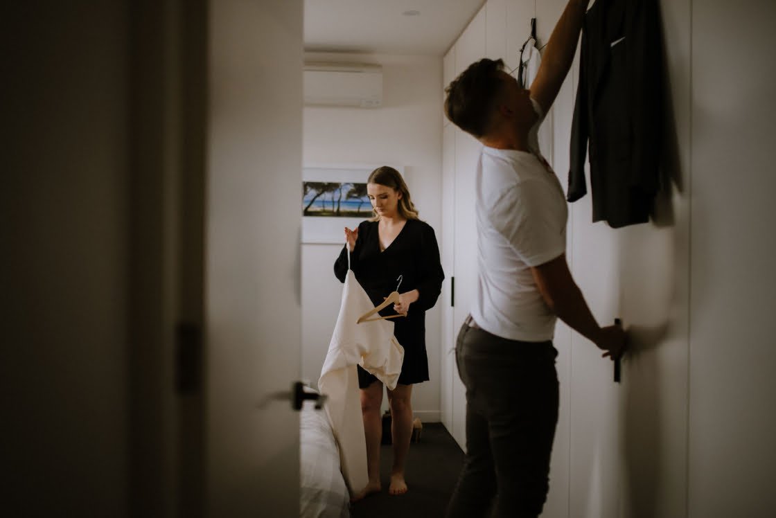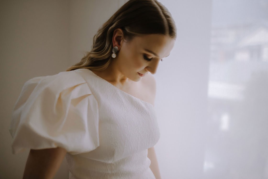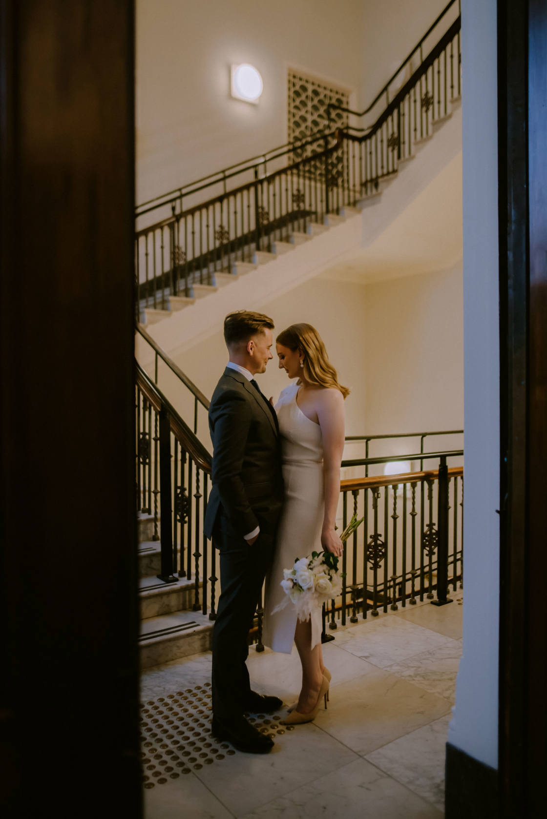 THE DRESS “I had a beautiful gown made by Hera Couture for our big wedding that fit the winery/marquee event we had planned, however it didn’t quite match the simple city elopement we were now planning. We decided to go with a cocktail dress code, so I went searching for the perfect dress, finding it at Rebecca Vallance in Armadale, Victoria. I paired it with simple nude heels I already had in the wardrobe and beautiful pearl earrings from Amélie George Bridal.”
