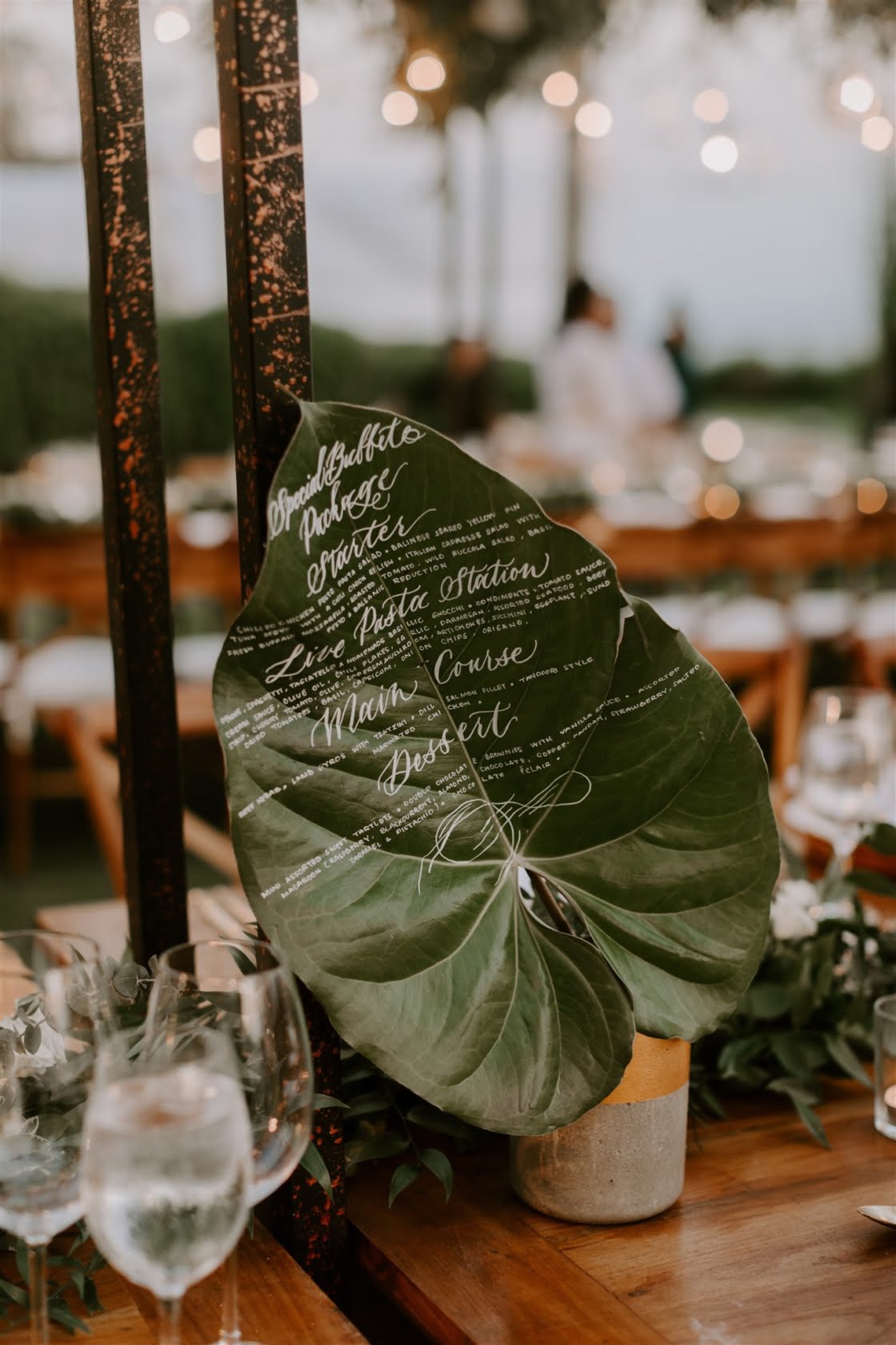 FAVOURITE DETAILS “One of my favourite details from the day was having the menu written on leaves on the table. For the seating chart, we had a huge board with “Take a Shot, Take a Seat” written on top. Also, the menu for the buffet was written on a leaf which went perfectly with the decor.”