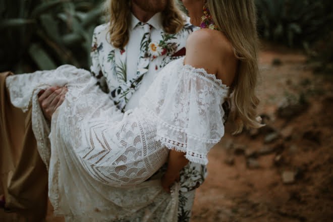 THE DRESS “I was super indecisive when searching for a dress! Although there were dresses I thought were amazing, I never found something that was ‘The One’, and sort of began to think that maybe not every bride thought that about their dress anyway. Then Grace Loves Lace dropped their Elixir range six months out from our wedding date. My summer staple is off the shoulder tops and dresses, and the style combined with the amazing lace pattern made it an easy choice. I have never ever felt more beautiful than I did on our wedding day. I was super comfy, felt beautiful and sexy, but importantly my dress also had enough stretch to fill up on tacos and margaritas, and get low on the dance floor!”