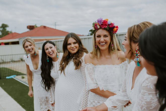 CONTRIBUTING VENDORS Photographer Elsa Campbell Florist One Day in March Stationery Habitat Legit Printer Vistaprint & Officeworks Ceremony & Reception Cactus Country Catering, Taco Bar & Donuts Pinchos Catering, Andiamo Street Food & Pop Up Supper Clubs Decorative Elements & Wedding Favour Bottles Kmart Wedding Favours Casa Iberica Deli Hot Sauce Furniture & Lighting Bang Event Co. Sound Hire Albury Sound & Lighting Celebrant Ceremonies to Celebrate Engagement Ring Angus & Coote BRIDE Bridal Gown Grace Loves Lace Pajamas & Slippers Best & Less Shoes Aldo via The Iconic Earrings Mercedes Salazar via Shopbop Ring Samantha Wills Bridesmaid Dresses Alice McCall, Forever New, Pink Blush & Witchery Bridesmaid Shoes Nasty Gal Bridesmaid Earrings JT Luxe GROOM Suit, Groomsmen Suits & Tie Asos Shirt Connor Shoes & Groomsmen Ties Roger David Groomsmen Shoes Target
