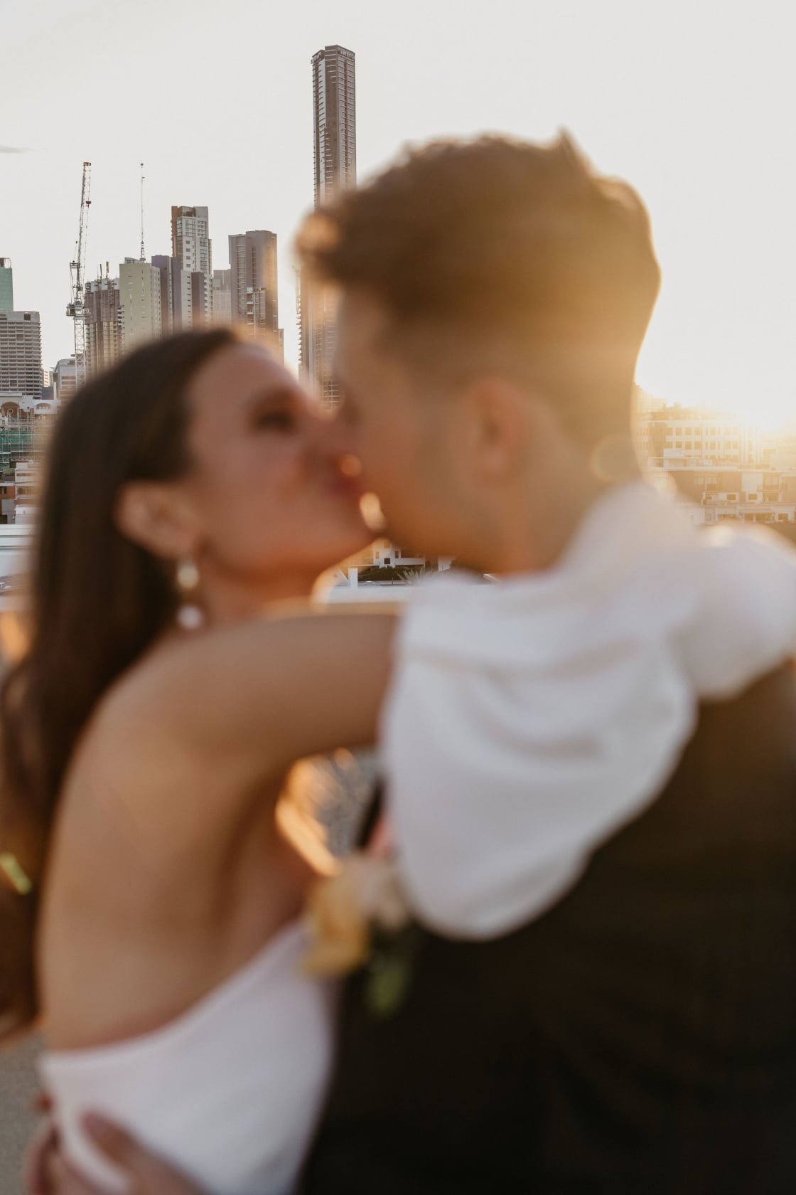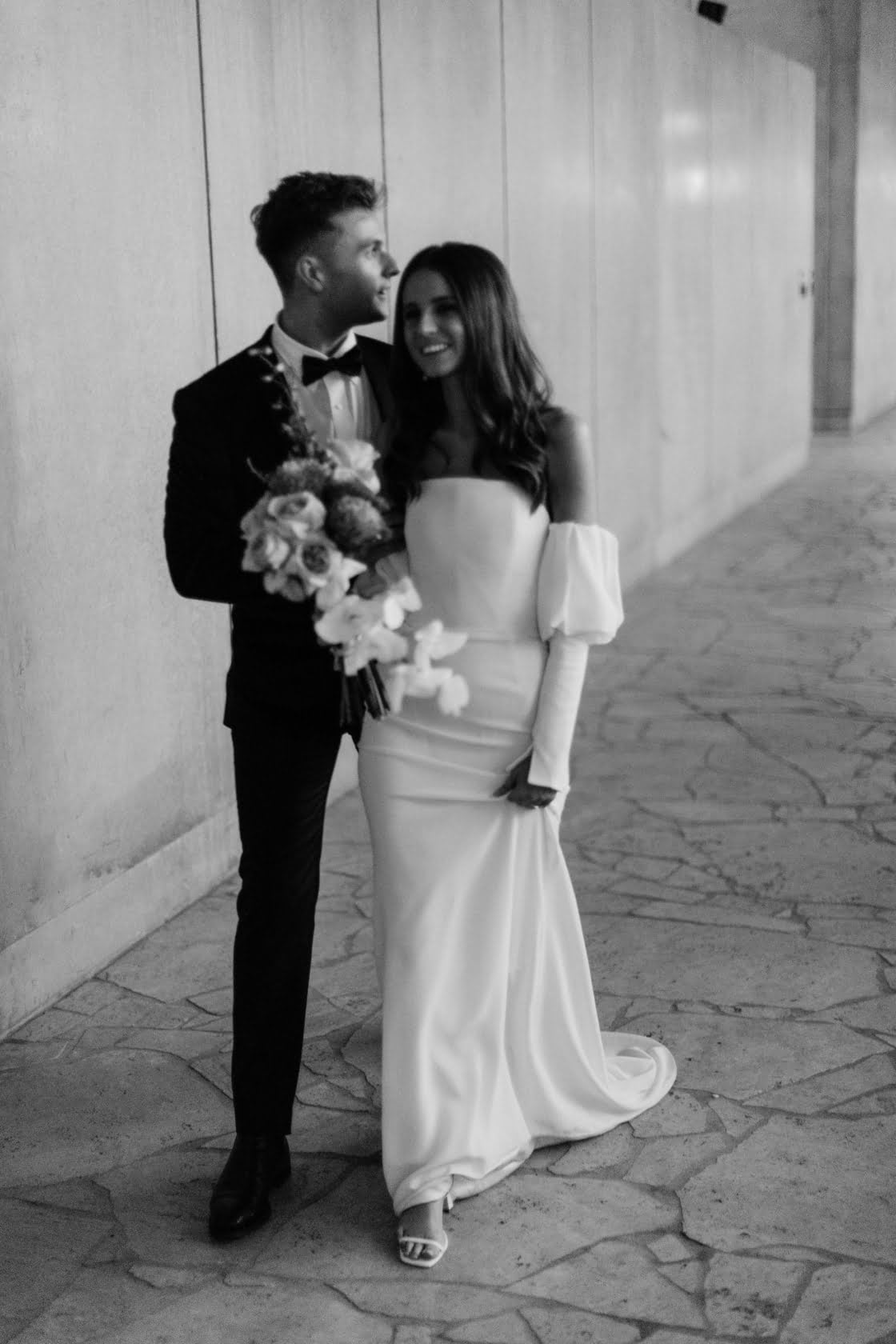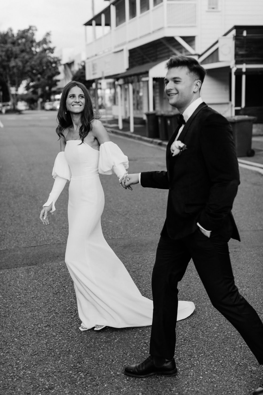 These two got married twice. They eloped during COVID (“it turned into a viral Tik Tok reaching 500k views, then got picked up by Daily Mail Australia and the rest of the world,” says the bride) but the one we are bringing you today is this urban delight, six months later. The stunning Prea James Bridal gown was bought from one of our go-to QLD bridal boutiques, Sphere Bridal Gallery and the pics are by the talented photographer/ videographer Milk and Honey Creative. Scroll down for more…
