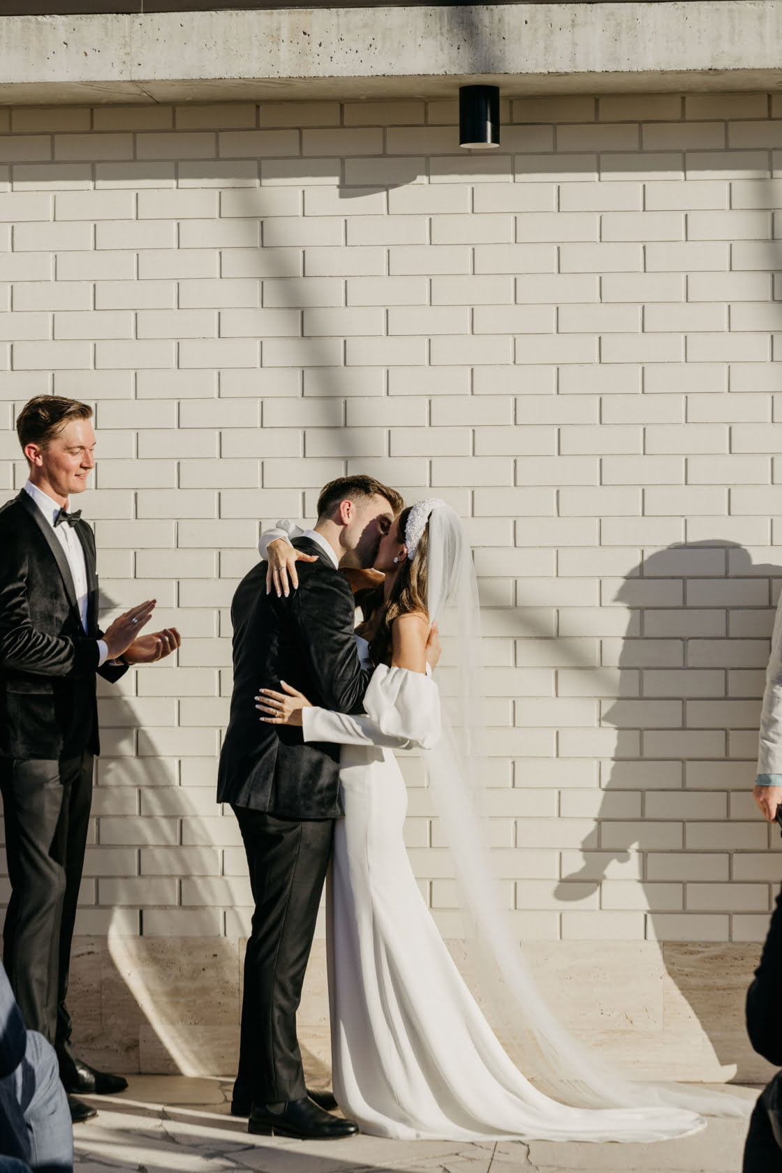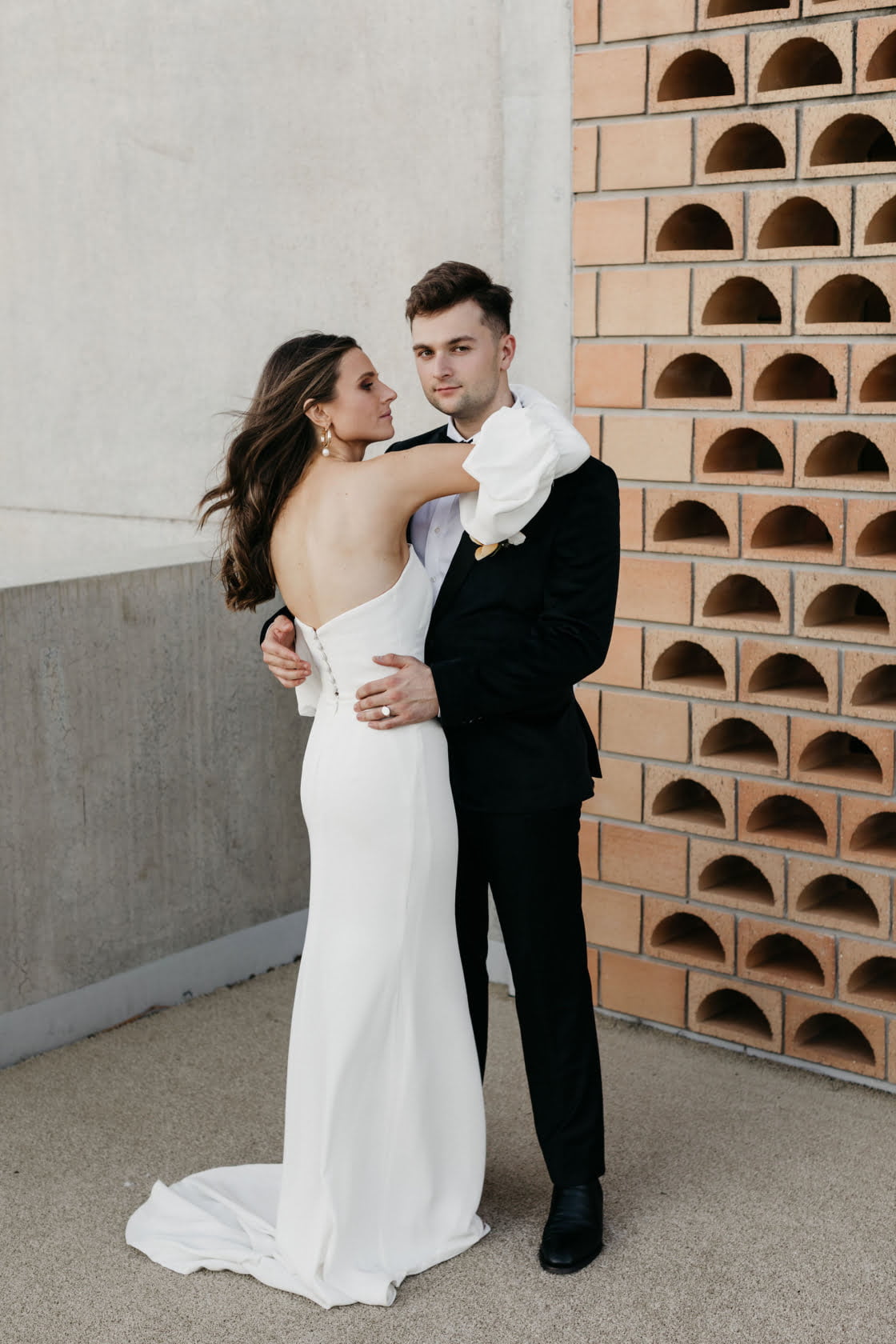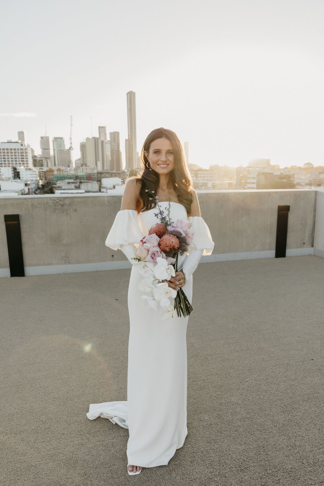 These two got married twice. They eloped during COVID (“it turned into a viral Tik Tok reaching 500k views, then got picked up by Daily Mail Australia and the rest of the world,” says the bride) but the one we are bringing you today is this urban delight, six months later. The stunning Prea James Bridal gown was bought from one of our go-to QLD bridal boutiques, Sphere Bridal Gallery and the pics are by the talented photographer/ videographer Milk and Honey Creative. Scroll down for more…