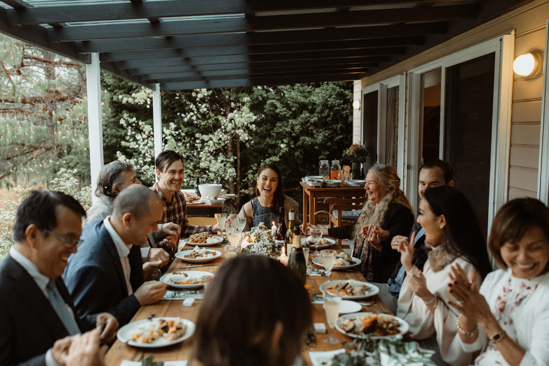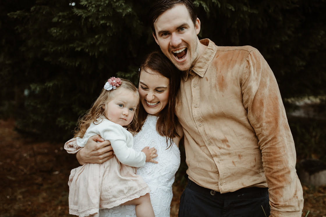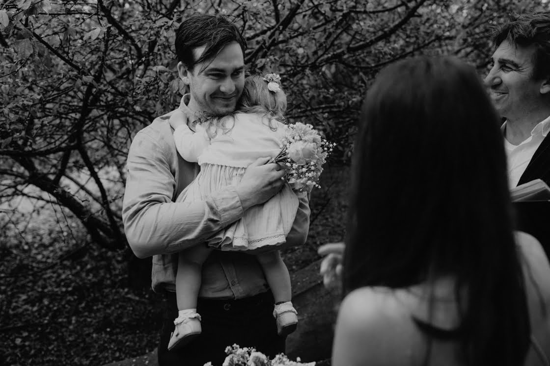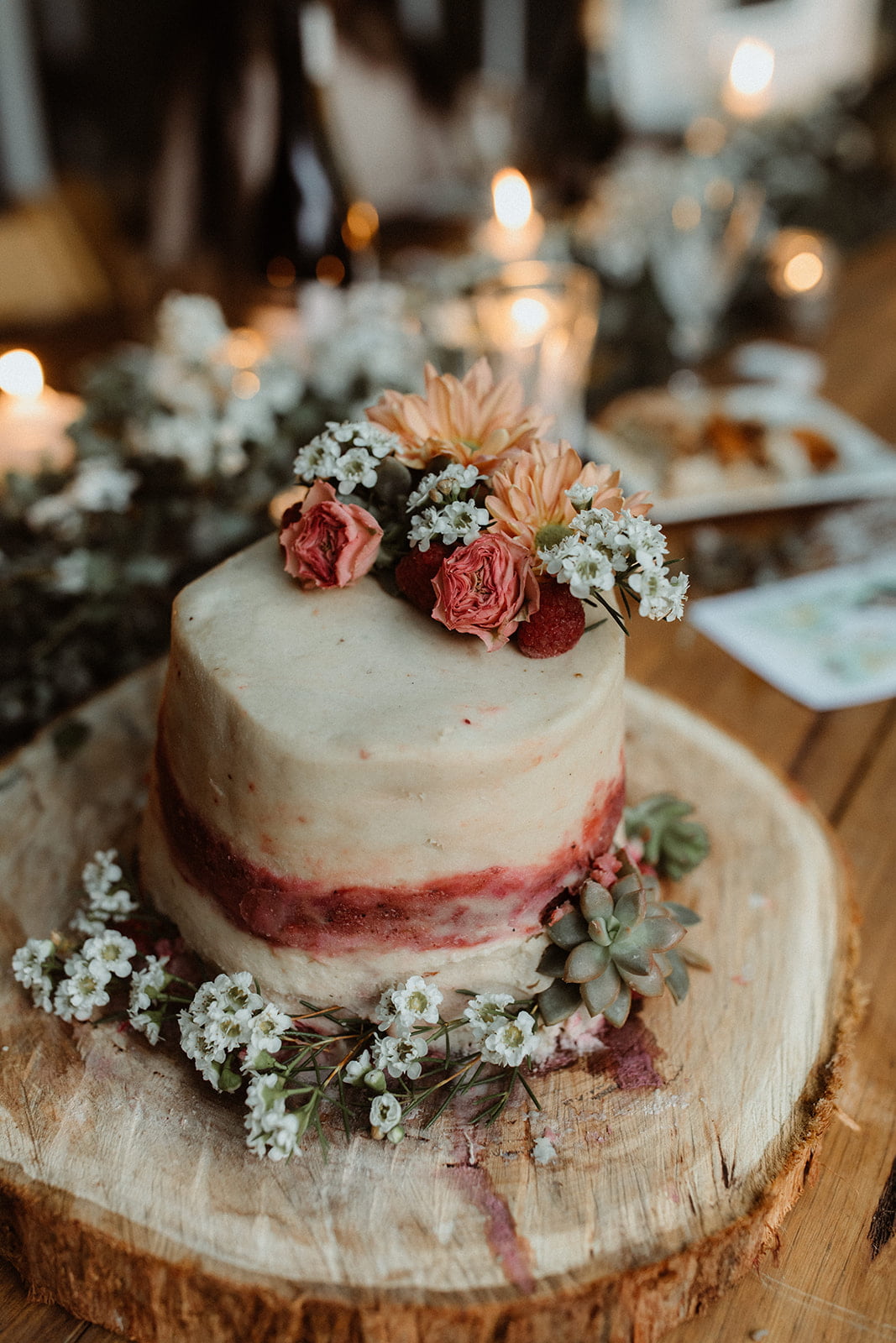 FAVOURITE DETAILS “The table setting and flower arrangement. I picked them up at a flower farm the day before and took a gamble doing a table garland myself and it turned out better than I could imagine. Our beautiful friend Elly made our cake, It was a raw vegan raspberry cheesecake. She had her husband outside chainsawing a tree to put it on. She definitely added extra love to it. My daughter wore a light pink linen Spell dress that tied into the flowers and she looked so beautiful.”