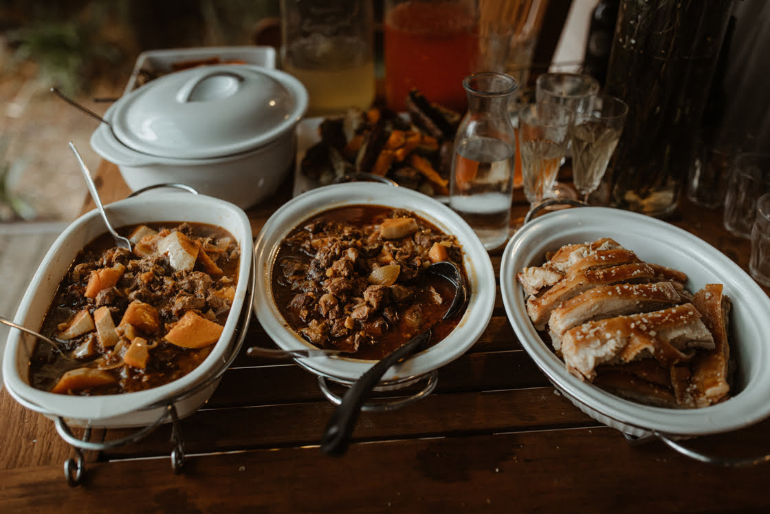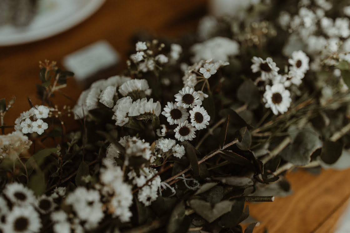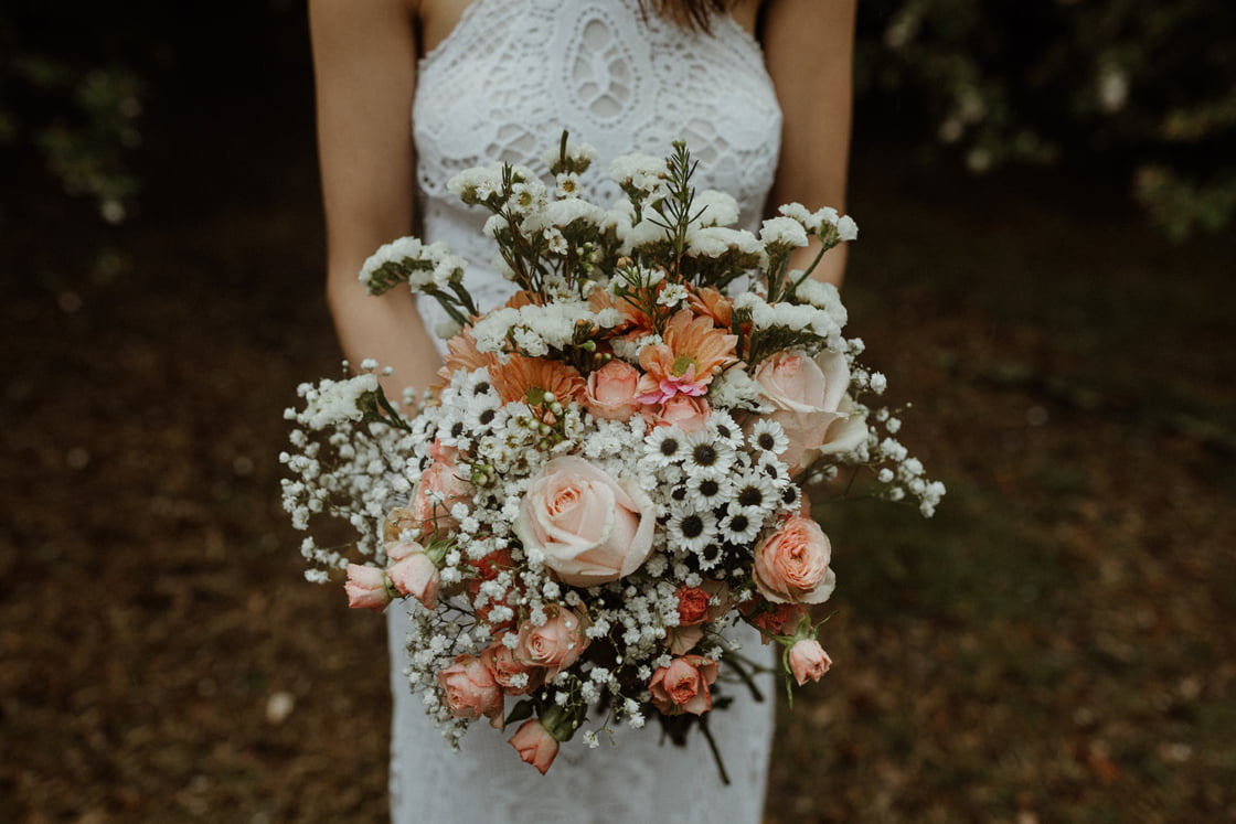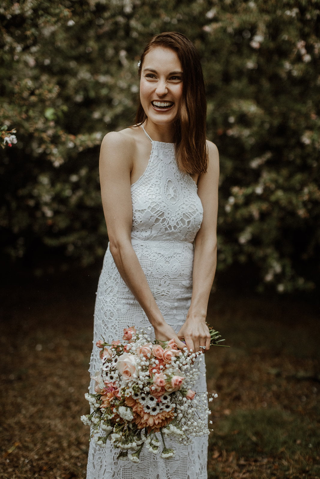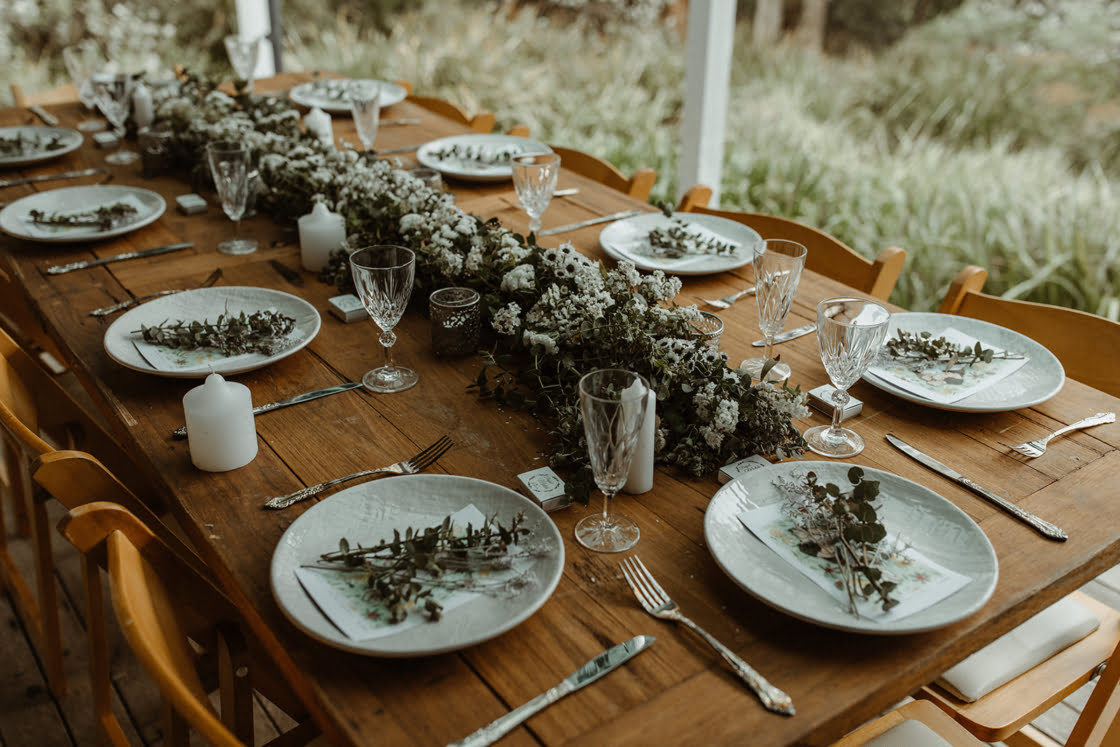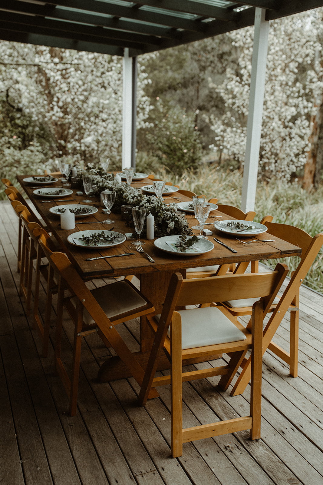 DIY “We did everything ourselves! I’m too picky to let someone else do it and I had such a distinct vision of what I wanted. I spent the weeks before on Pinterest getting ideas. We are lucky to live near some amazing flower farms, so the day before I choose the flowers I wanted from the colour palette I had in mind and then that night whilst it poured down rain in Kangaroo Valley, I laid all the flowers on the deck outside and put together our bouquets and floral rings. The next morning I made the flower garland and decorated the table. I found some amazing vintage cutlery from Vinnies and the set out was one of my favourite things of the day. Tom cooked and all the family were in the kitchen putting the last touches together. Tom is an amazing cook and it felt like a family dinner with the excitement of when everyone comes home for a special occasion.”