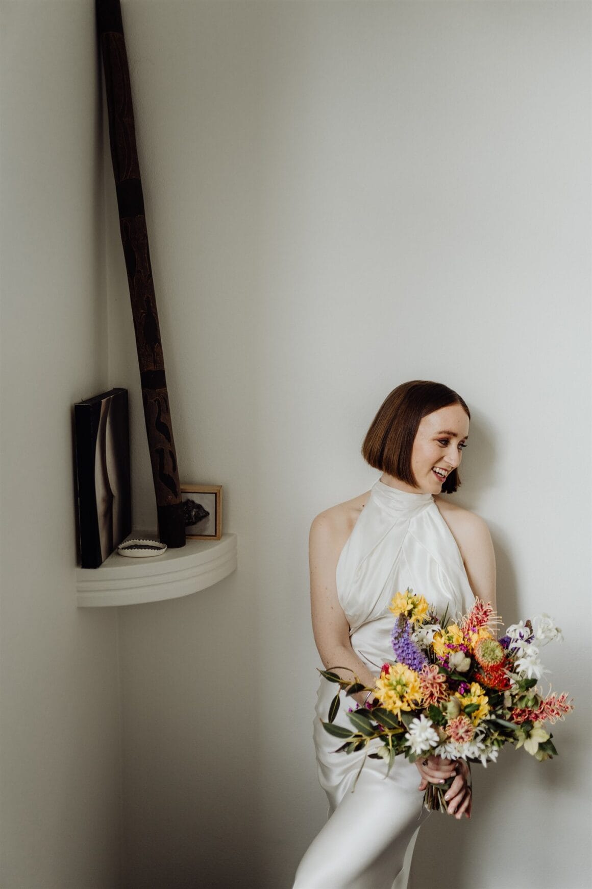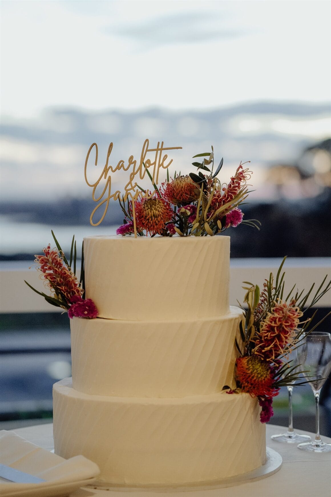 FAVE DETAILS “We were really happy we under-did all the little things like flowers, cake and invites, and just went simple. It really meant that the venue, which is stunning, and us (especially Charlie) became the complete focus. Especially glad we got no ceremony flowers so that the native bush and the view shone. The flowers we did get were all natives, which was important to us.”