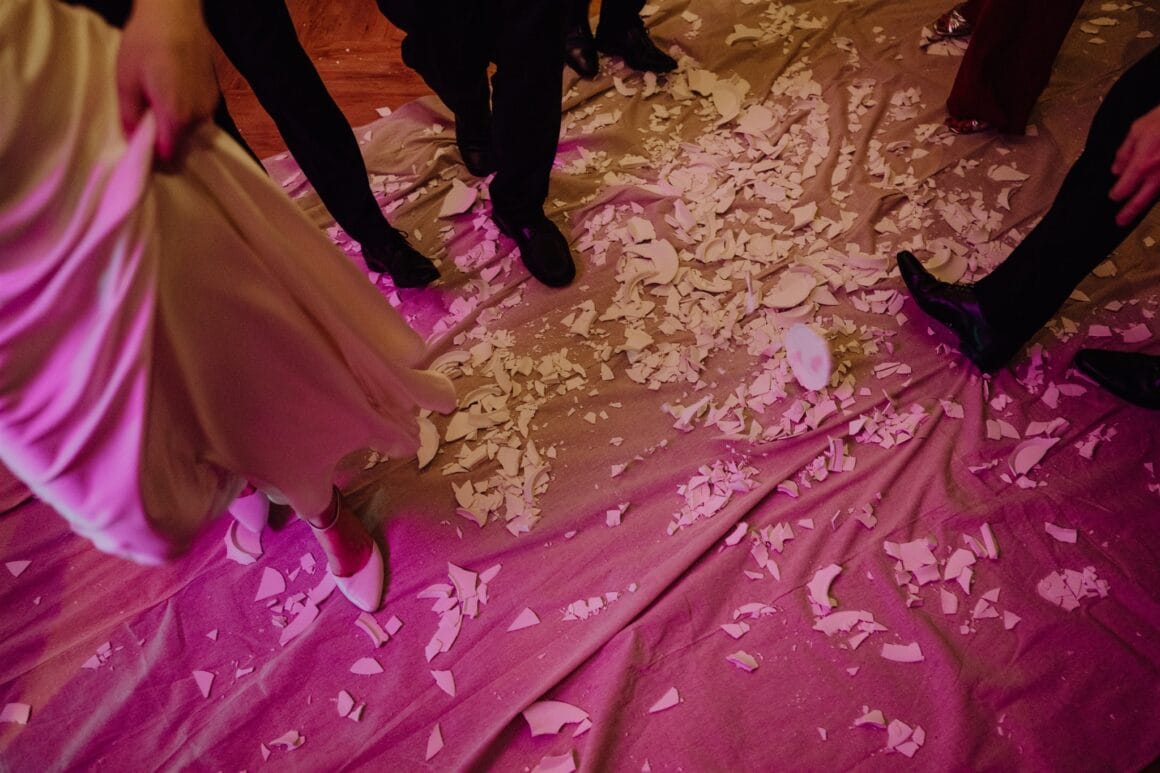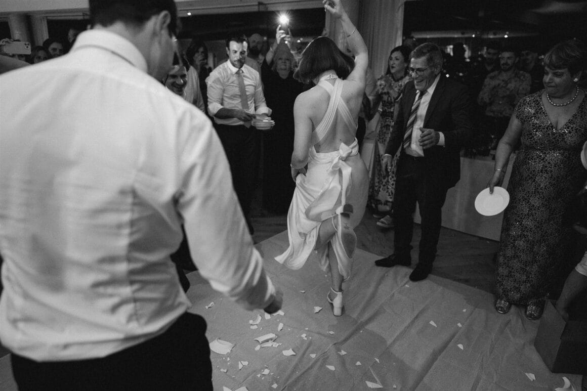 COOL CUSTOM “We had a whole segment of Greek dancing in the night, which was awesome. All the Greeks, including the oldies, came out of the woodwork onto the dance floor, and all our non-Greek guests leaned into the chaos. It ended with smashing some ceramic plates and drinking a shot of ouzo off the floor without your hands, both of which are classic Greek wedding traditions.”