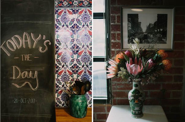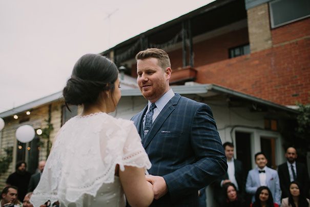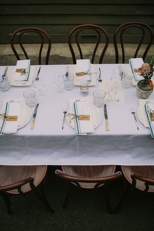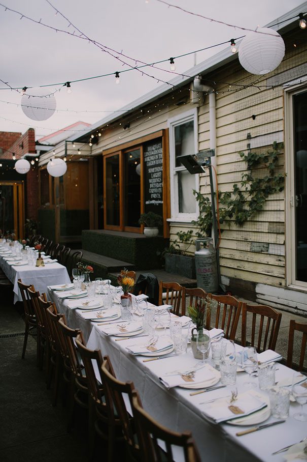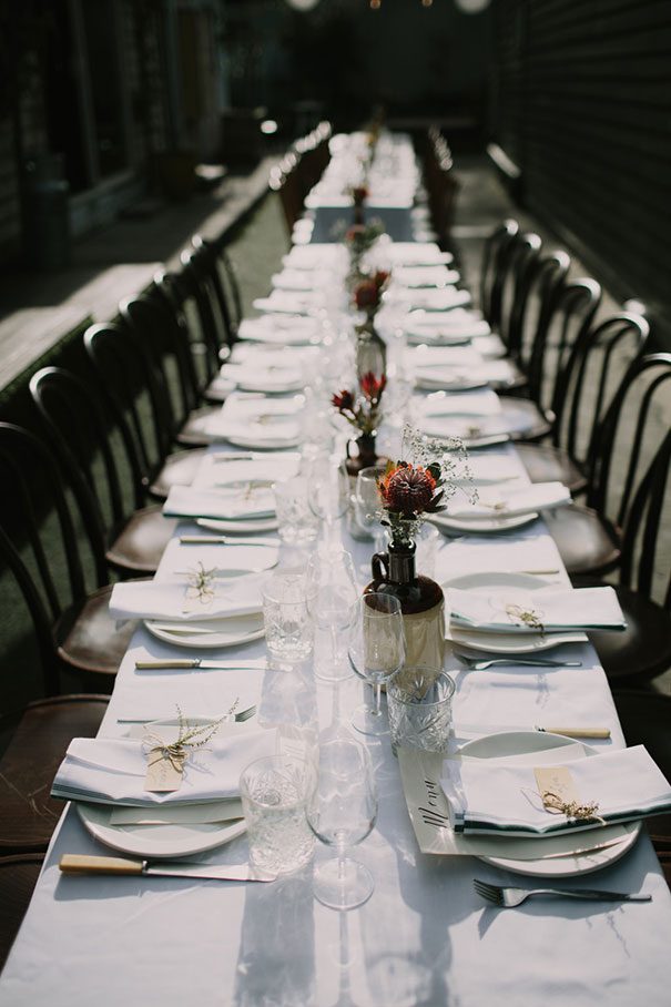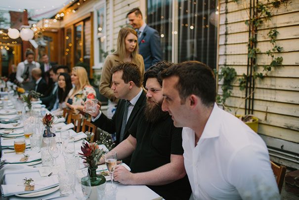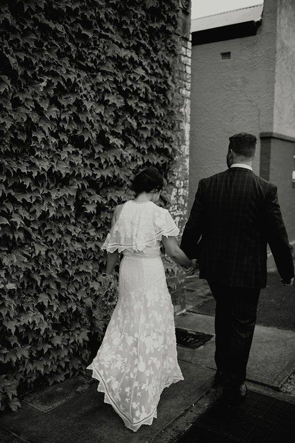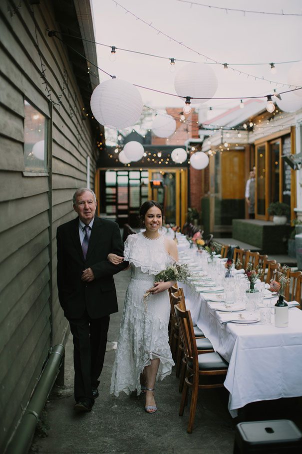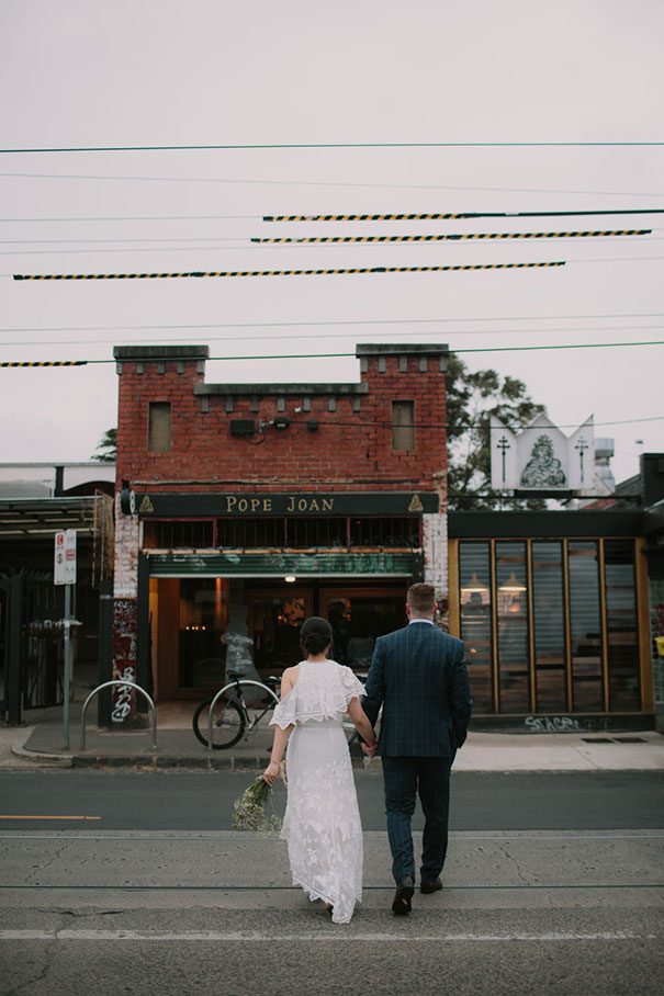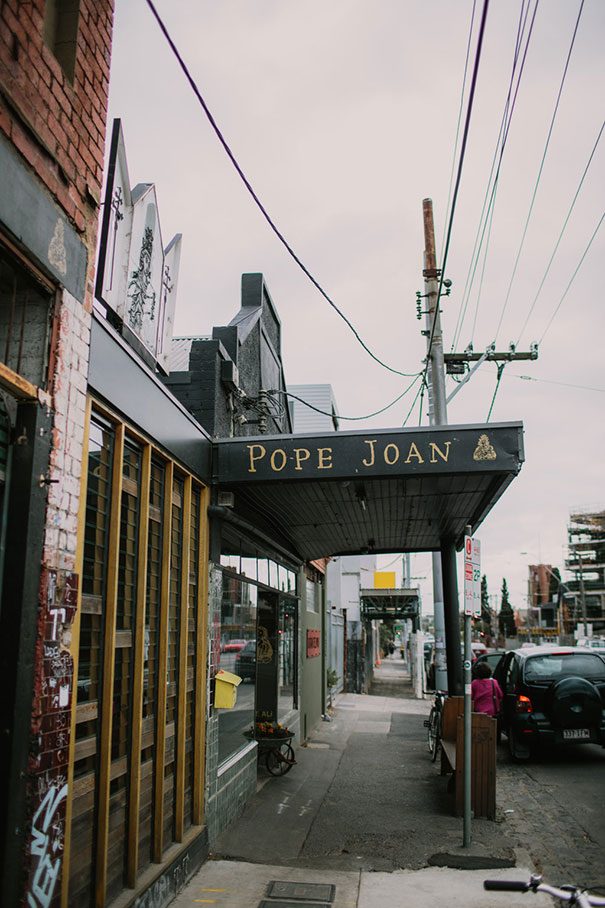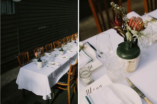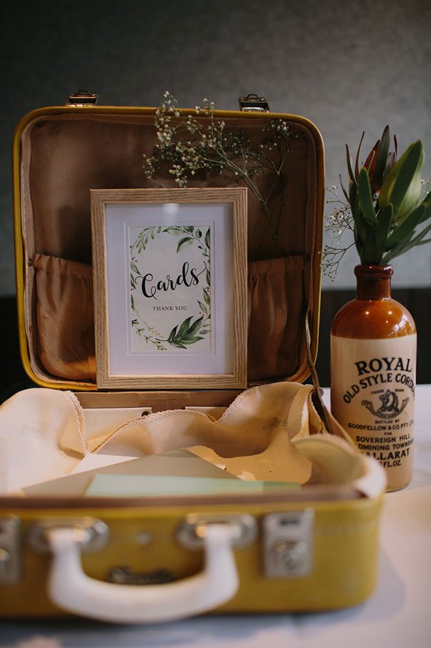 A ten month engagement saw the couple embark on a DIY journey that included scouring every op-shop in Melbourne for vintage alcohol decanters and creating their wishing well with antique suitcases. “Our favourite detail of the wedding was the special touches that our mothers contributed. My mum, Zita, made home-made delicious mango jam and presented them in cute little jars to give as gifts to our guests,” said the bride, who booked Pope Joan as their venue after discovering the intimate space, delicious food and perfect space to cater to the ceremony and reception.