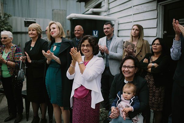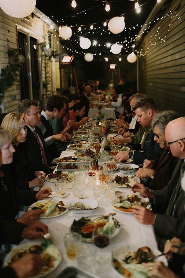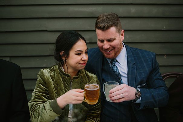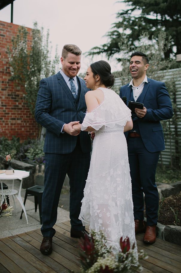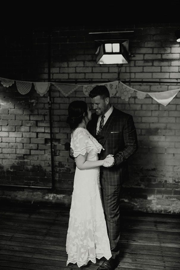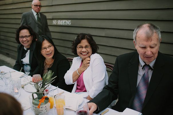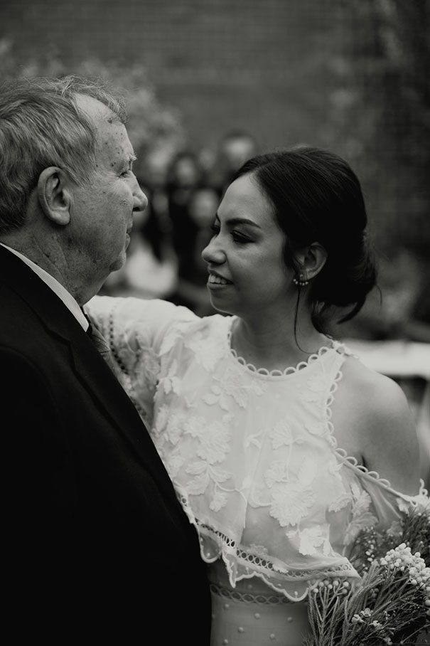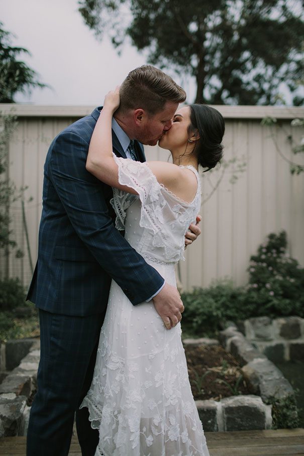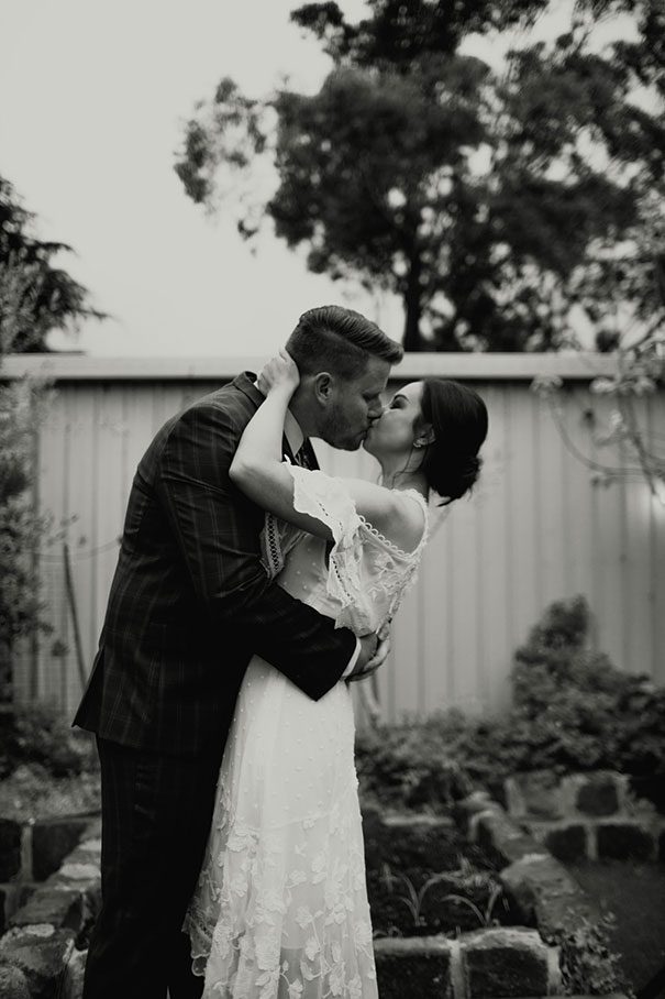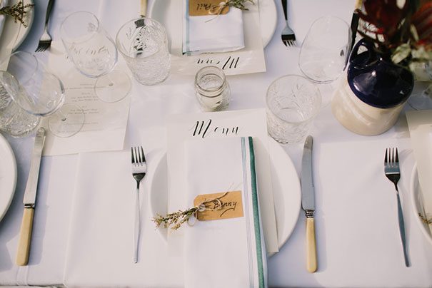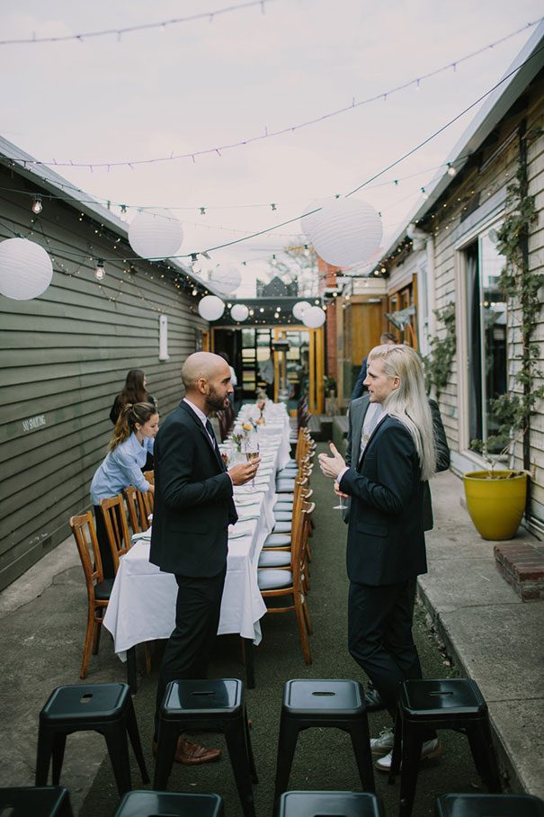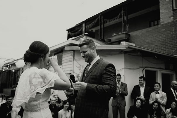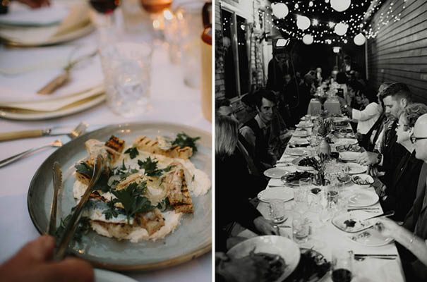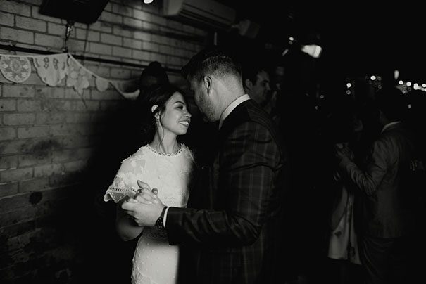 A ten month engagement saw the couple embark on a DIY journey that included scouring every op-shop in Melbourne for vintage alcohol decanters and creating their wishing well with antique suitcases. “Our favourite detail of the wedding was the special touches that our mothers contributed. My mum, Zita, made home-made delicious mango jam and presented them in cute little jars to give as gifts to our guests,” said the bride, who booked Pope Joan as their venue after discovering the intimate space, delicious food and perfect space to cater to the ceremony and reception.